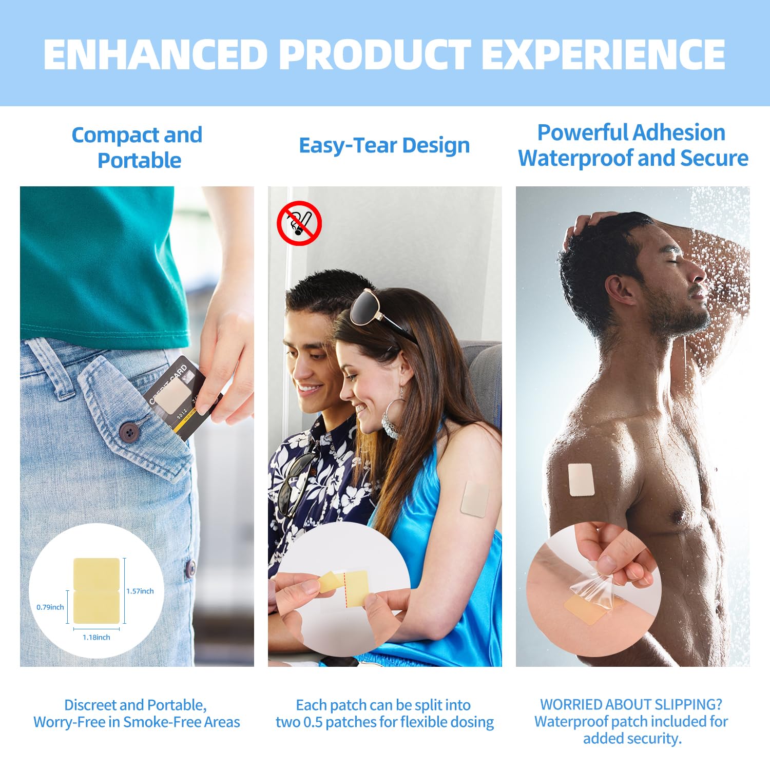 NIENJOY PATCHES AND ACCESSORY KIT: Each box contains 7 patches, each delivering 21 mg of active ingredient. NiEnjoy offers only 21 mg patches (no 7 mg or 14 mg options). For flexible dosing, each patch can be divided into two 10.5 mg portions. Unlike other brands with multiple steps (Step 1, Step 2, Step 3), NiEnjoy offers a simple one-step approach for efficiency. Each box also includes a waterproof, slip-resistant accessory kit, ensuring the patches stay securely in place and dry during activities like sweating, exercising, showering, or swimming.