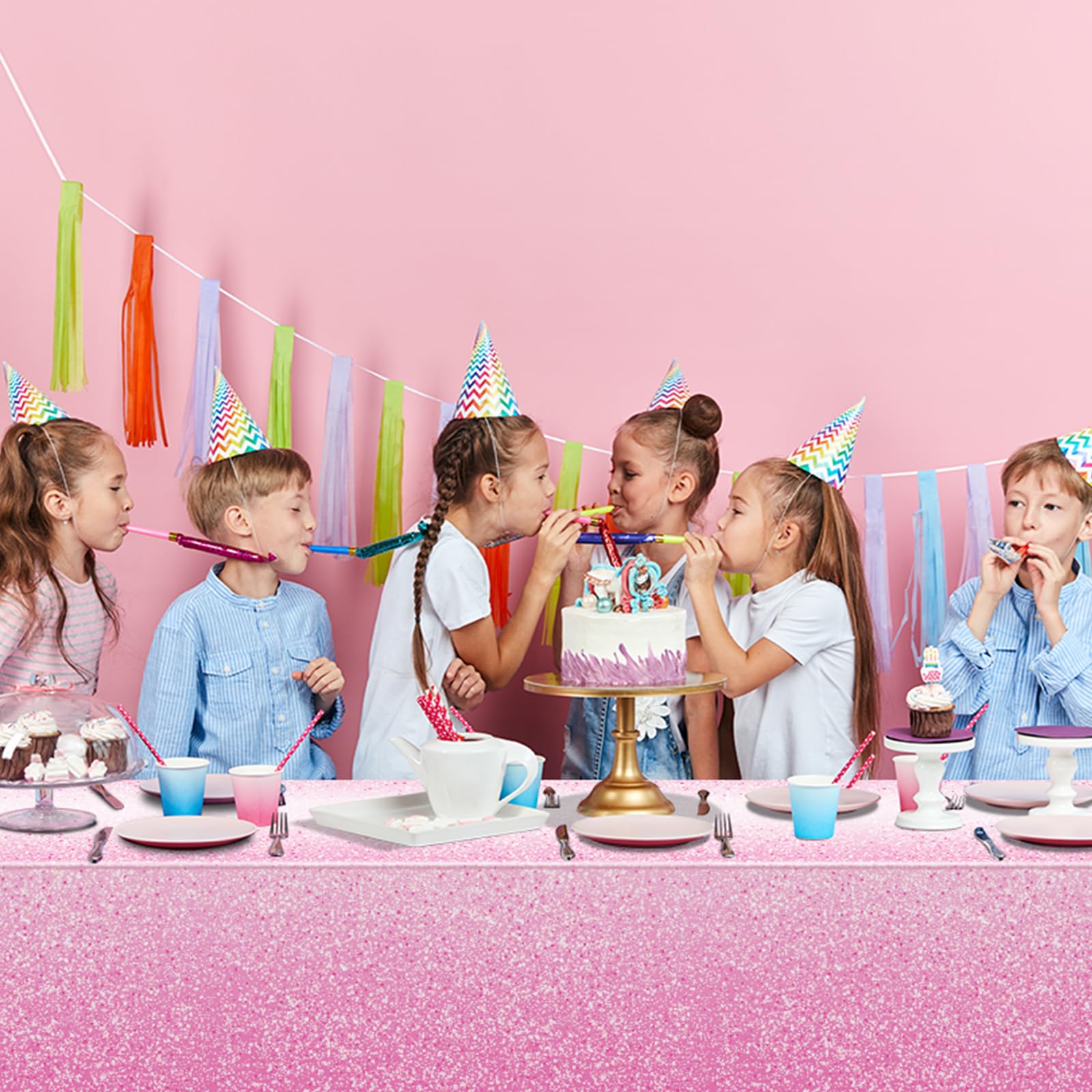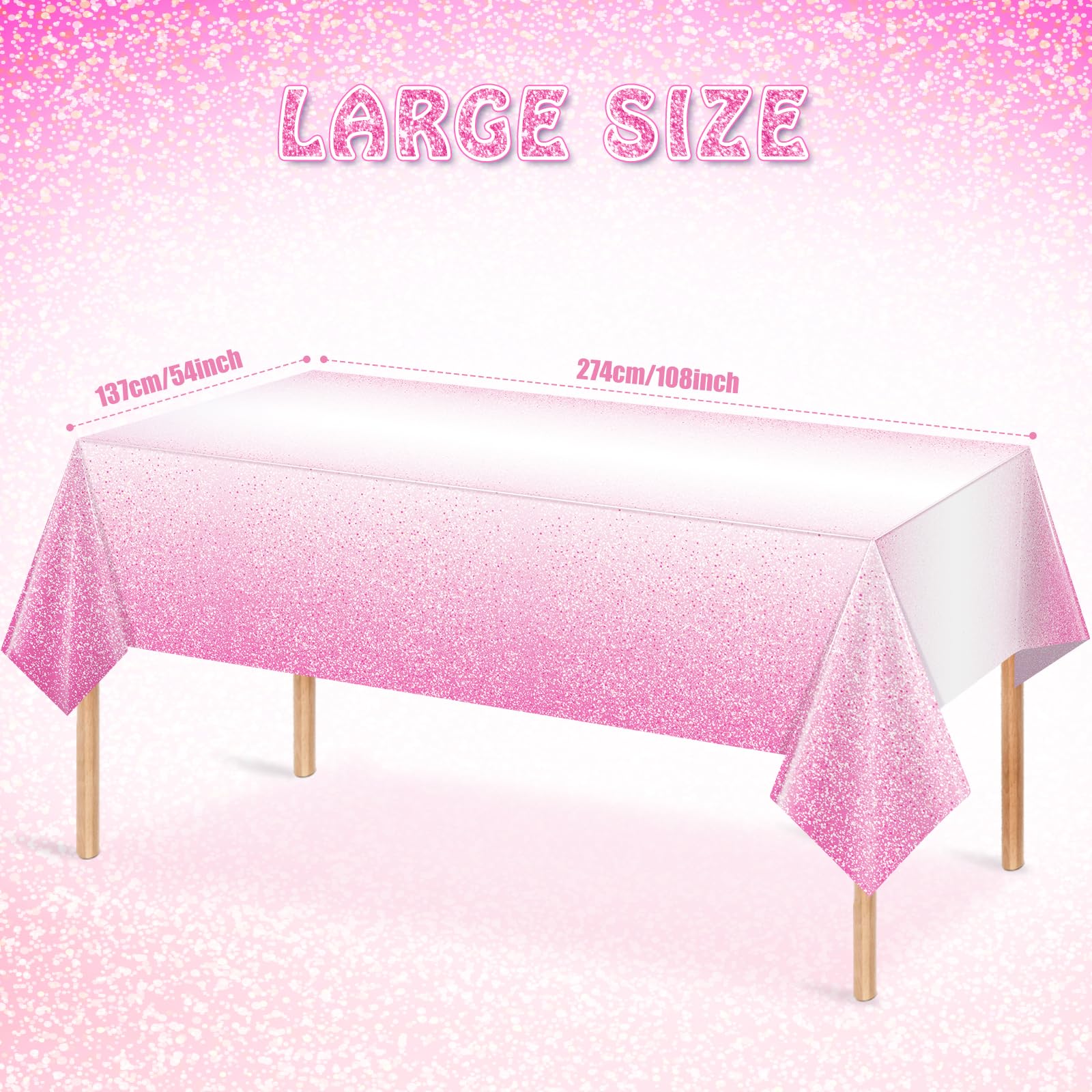 Gradient Pink Design: With a captivating gradient pink color and adorned with charming pink and white dots, our pink pastel tablecloth showcases a mesmerizing gradient design. This makes it an ideal centerpiece for your parties, adding a touch of elegance and sparkle to your event. NOTE: It is a shimmering effect created by alternating white dots and pink dots, but it is not a glitter tablecloth itself.