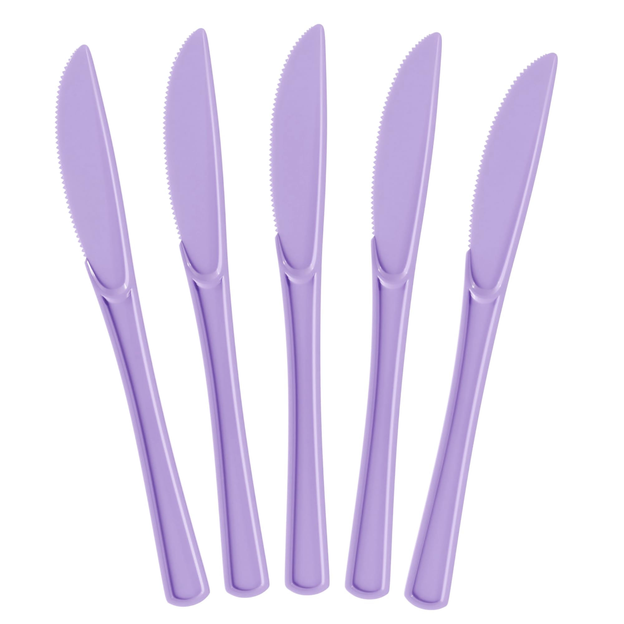 Includes: 50 pack of heavy-duty 7.5 inch Lavender plastic Knives. These durable Knives are strong yet disposable cutlery making them the perfect plastic silverware option for any party or occasion. Offering multiple different color options, they are sure to match you