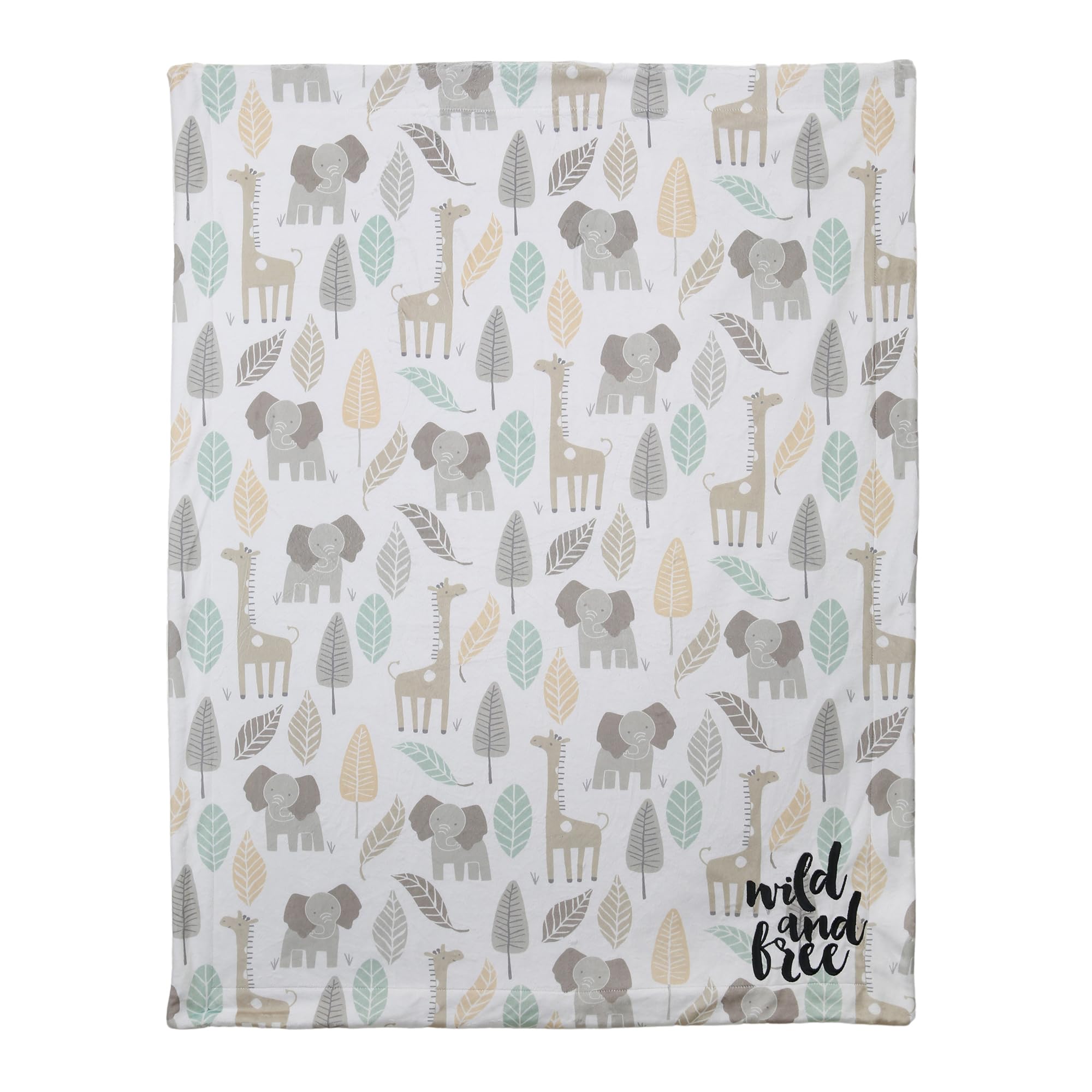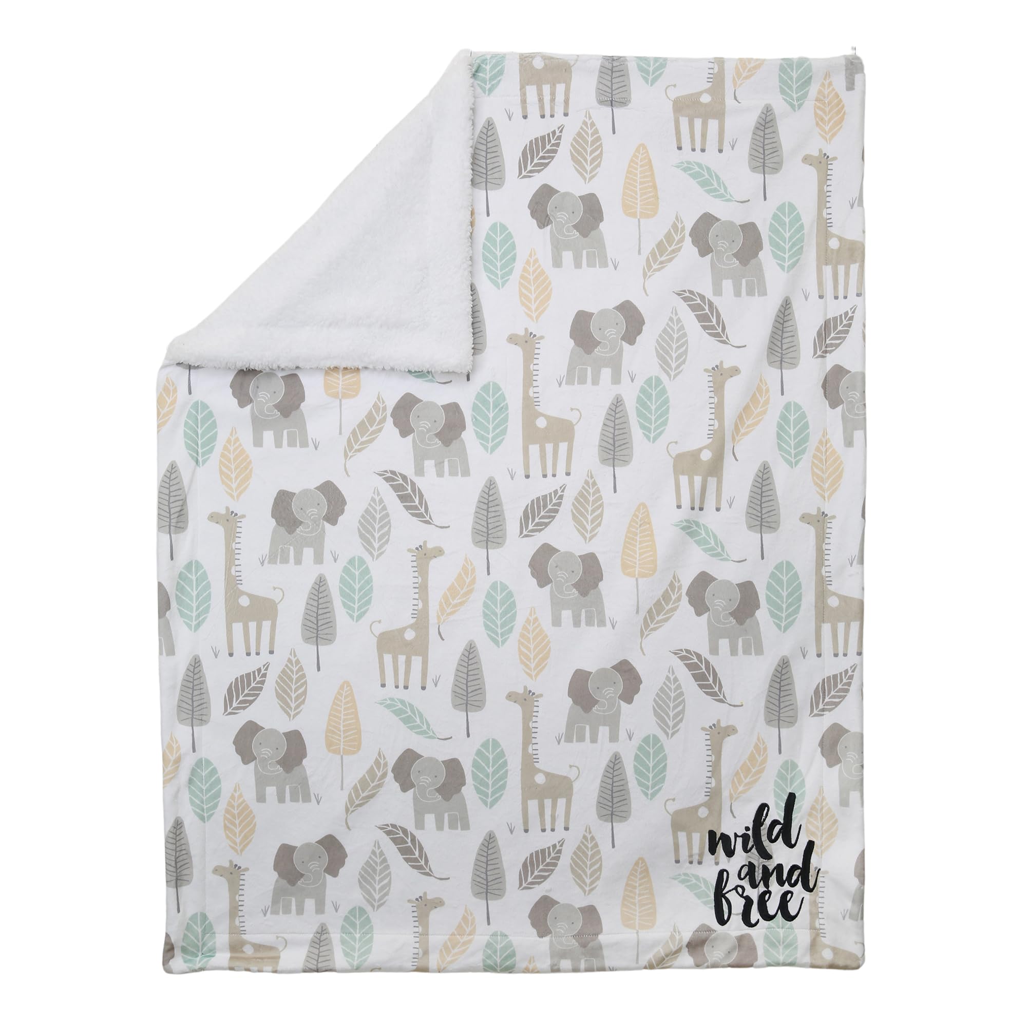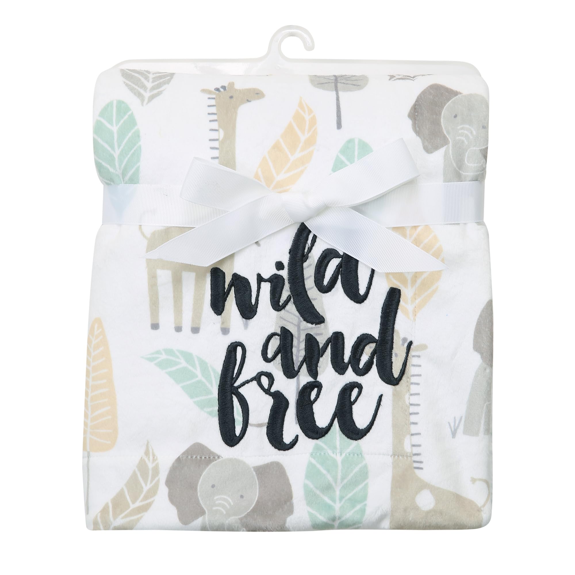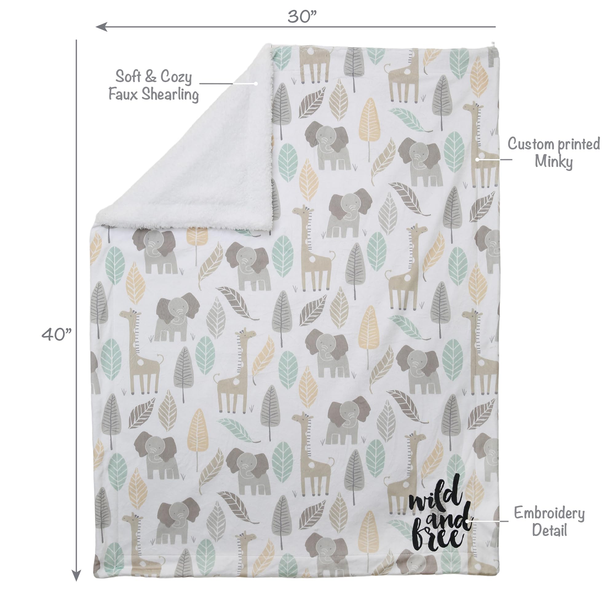 Cuddle up your little one with this soft, luxurious baby blanket. It features gray elephants with jumbo ears, tall giraffes, colorful leaves, trees, and the words wild and free embroidered in the right corner. This blanket is 30 inches by 40 inches and is the ideal size for a stroller blanket, going to the park, running errands, and is perfect for moms, dads, and babies on the go. Made in a soft and cozy minky front with a soft white faux shearling fleece back. It is machine washable for easy care and makes a great baby shower or welcome home baby gift.
