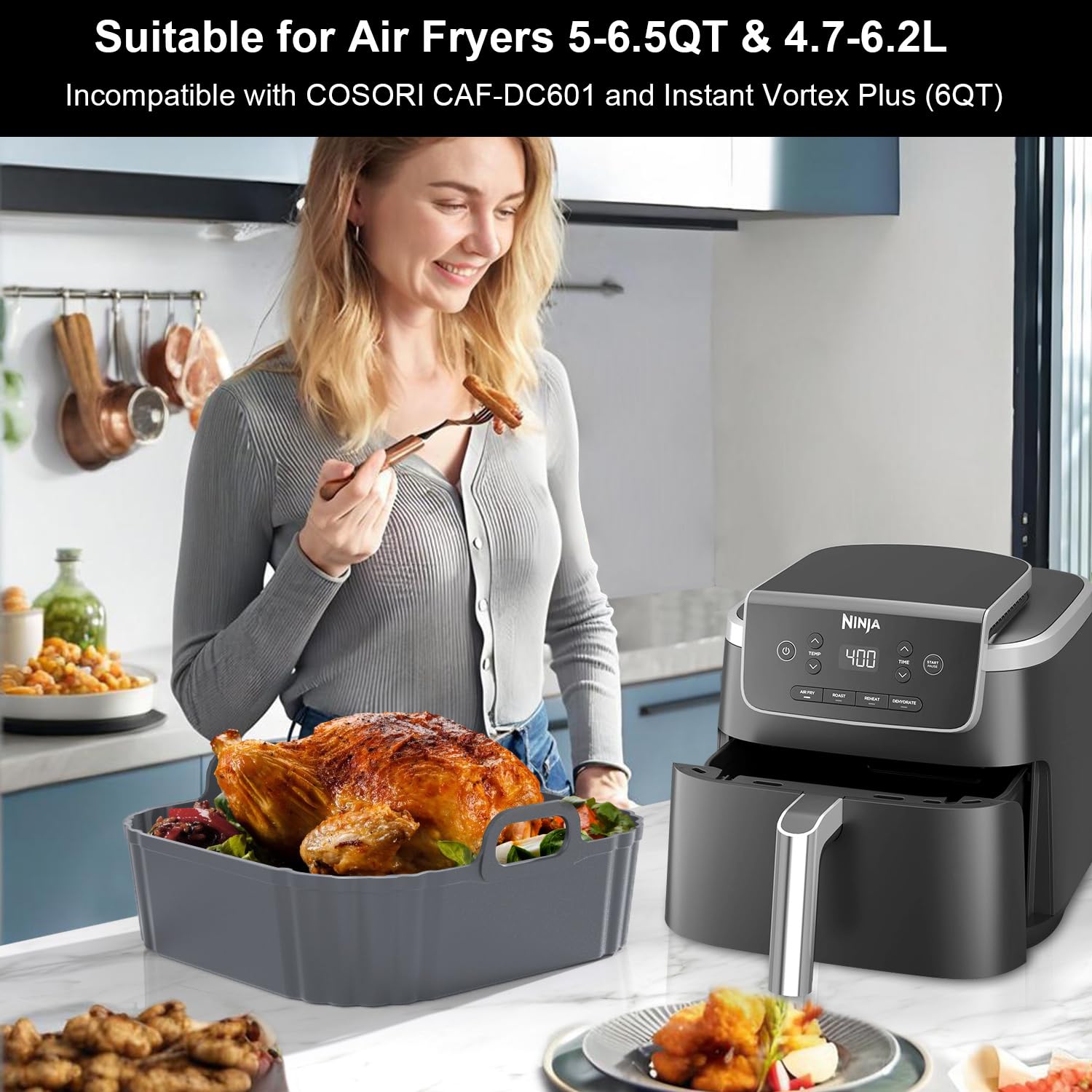 Square Silicone Air Fryer Liners Compatibility Guide: Our square silicone liners are compatible with 5-6.5QT air fryers. For the best experience, please measure the top dimensions of your fryer basket before purchasing. They fit square air fryers with a size of up to 8.9in (22.7cm). Not compatible with COSORI CAF-DC601 (6QT) and Instant Vortex Plus (6QT); compatible with Ninja AF181, AF141, COSORI CAF-L501, Cuisinart, and other devices.