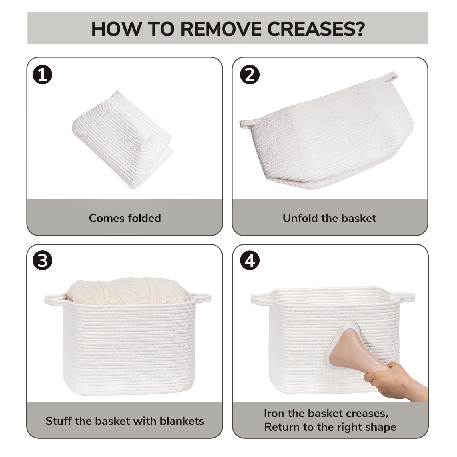 Note. These storage bins are folded for shipping. Fill it with a towel or blanket and it will quickly regain its elegant shape. Ironing is a good idea for restoring wrinkles. Also, you can fold it into a flat shape for easy storage when not in use