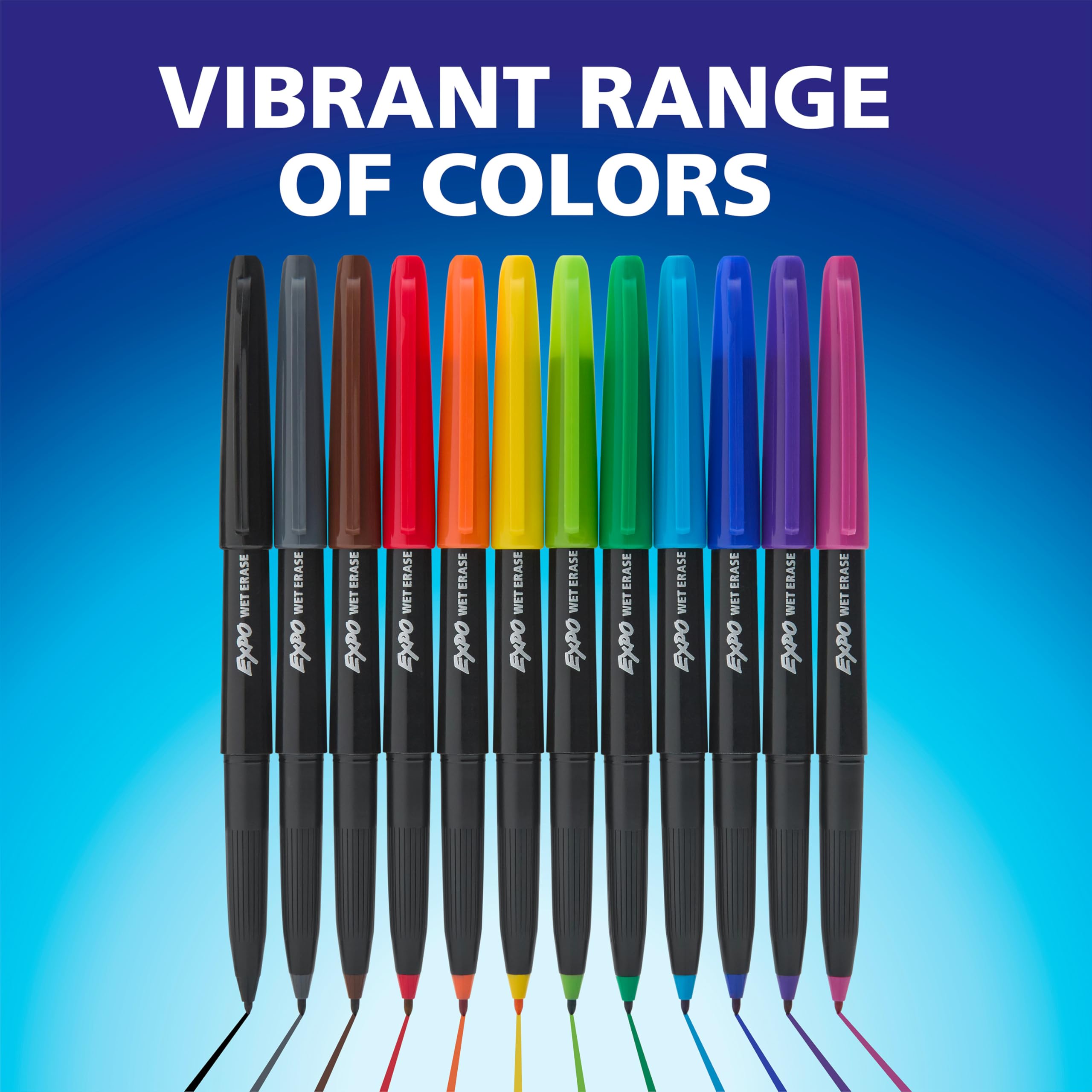 Improve organization and planning with the EXPO Vis-a-Vis Wet Erase Markers, which are designed for use on whiteboards, hard plastic, laminated sheets, and other nonporous surfaces. These markers go beyond standard teaching and office supplies and are also perfect for labeling dry food storage containers or creating clear, easy-to-read calendar entries. Boasting a fine-tip design for detailed lines, these markers come in a pack of 12 black markers for all your writing and drawing needs. The markers feature an ink that exhibits a vibrant hue and easily wipe off with a damp cloth.
