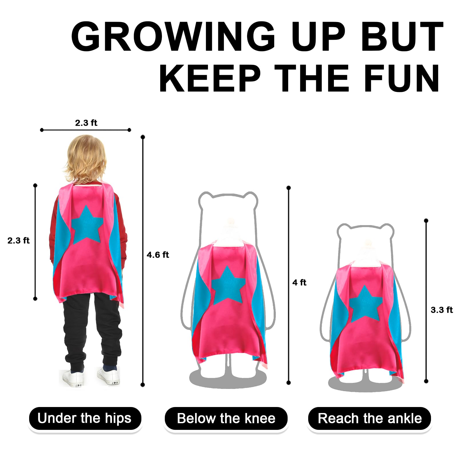 Party Capes Size: Superhero capes for kids, Length 27" x Width 27", designed for 3-9 years old kids. Reversible Dual Color Party Costume with 2 different colors.