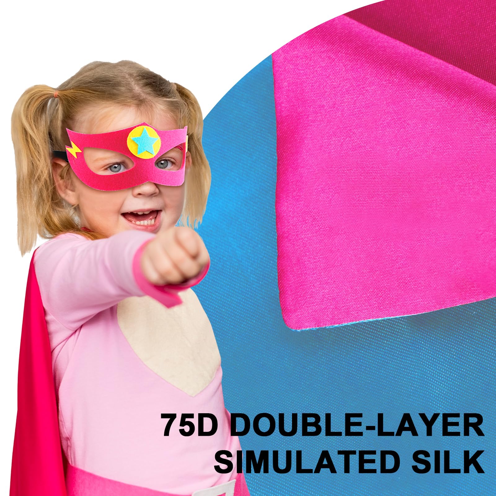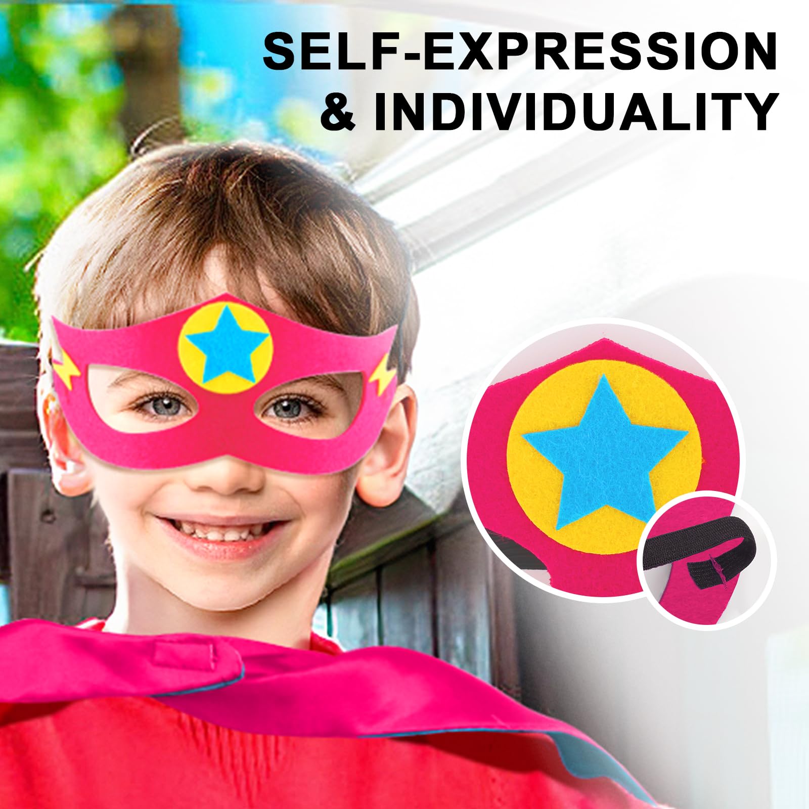 Kid-Friendly Design and Materials: Super hero capes for kids, made out of satin fabric, with Velcro sewn onto the neck to make it easy for your little one to get it on and off themselves. Masks are soft felt and easily adjustable to strap onto any size head.