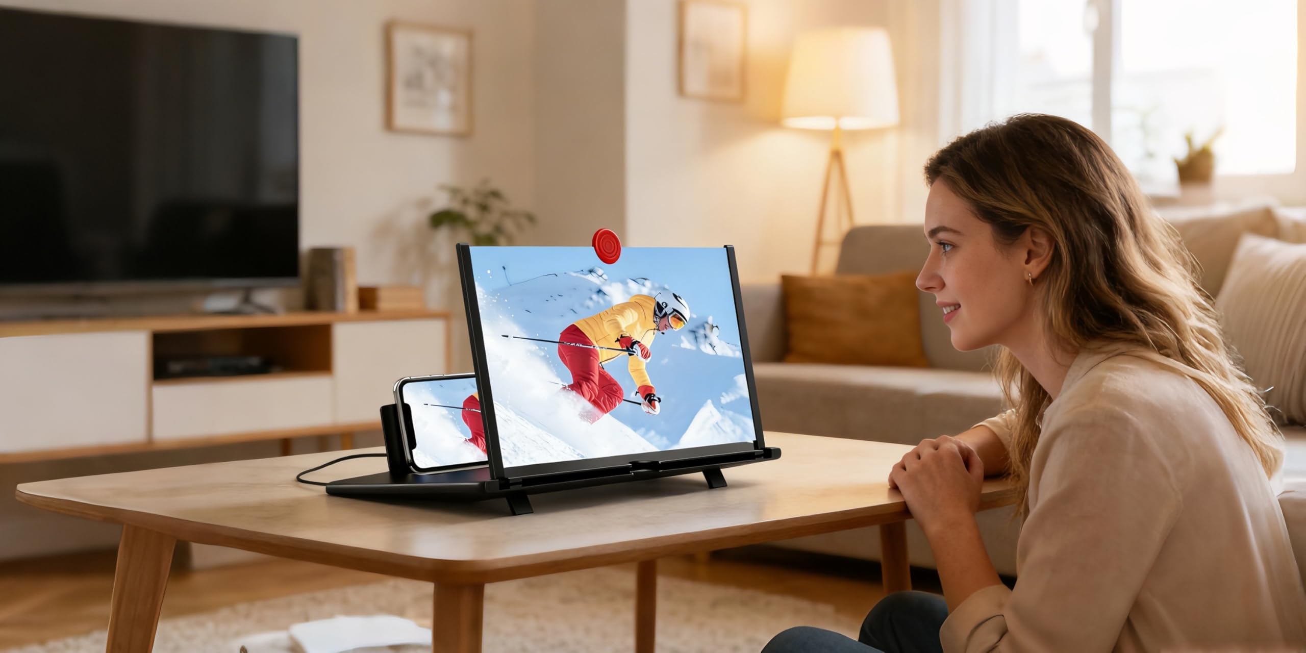 [Folding Design]: HD screen magnifier Storage type rotating folding design. If the height is not enough, height can be adjusted with the ring stand. Super slim when folded and also can be carried around in your bag. Suitable for indoor, camping, journey, leisure, anywhere and etc.
