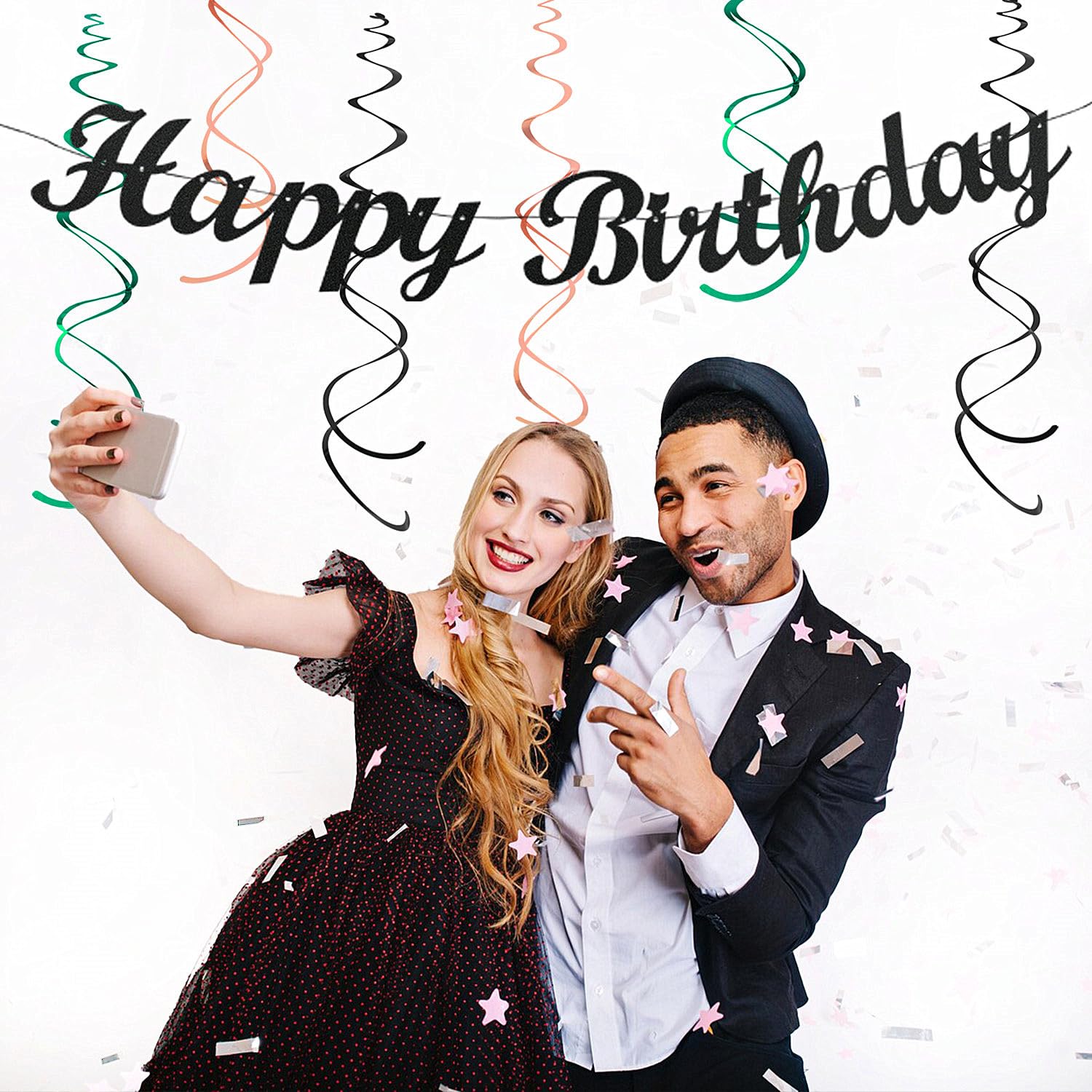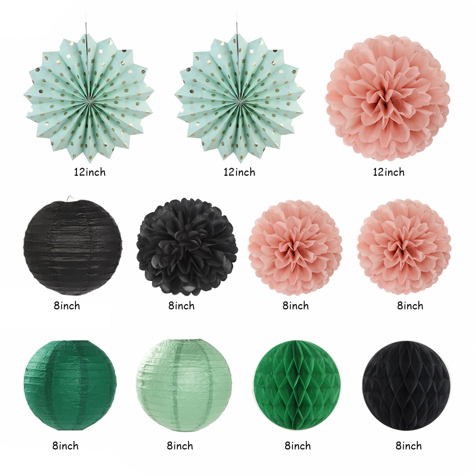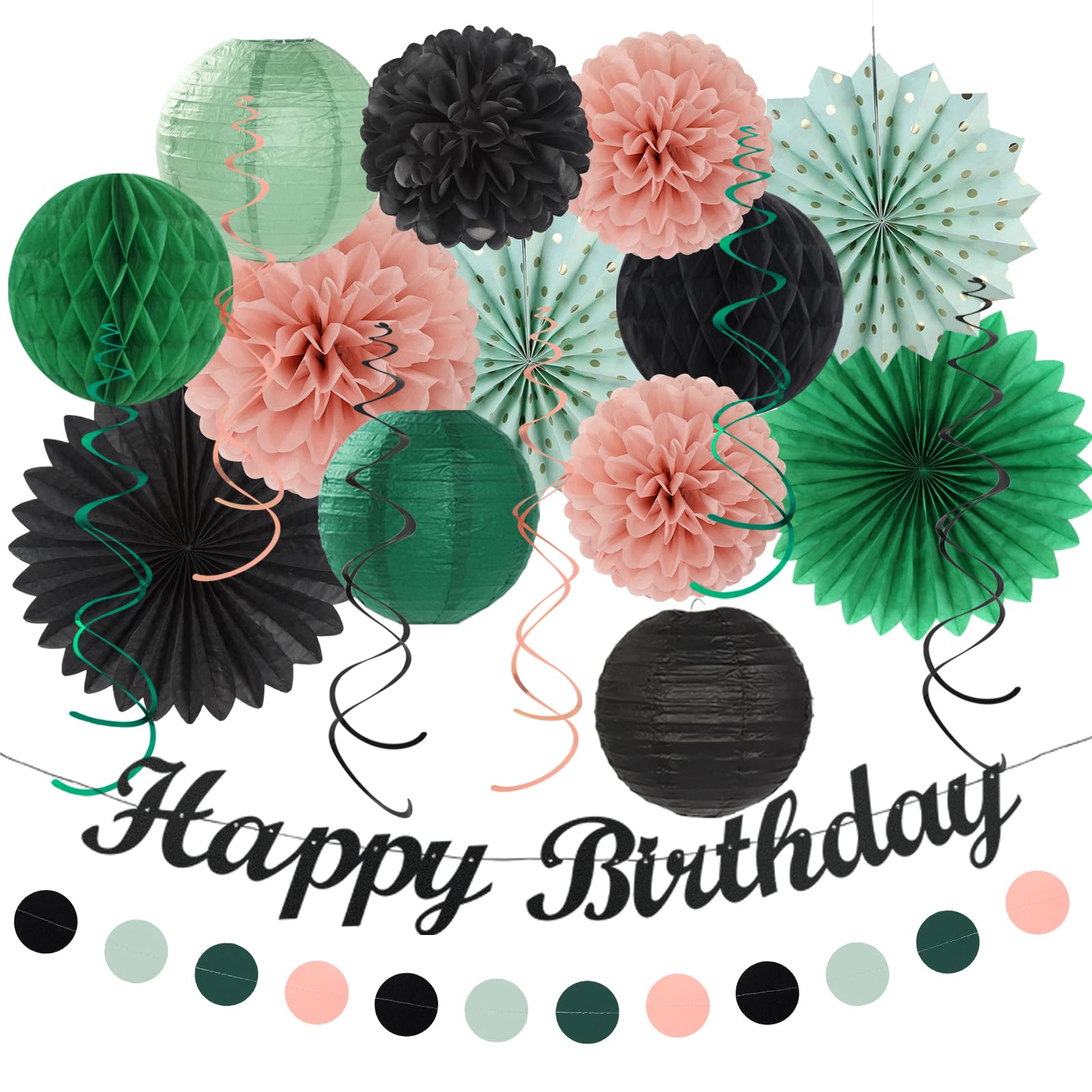 【Sage green Blush Pink Black Party Decorations Kits】This kits include 1pcs happy birthday banner, 1pcs circle dots paper banner, 4pcs tissue flower pom poms: 3pcs 10" and 1pcs 12" , 3pcs 8inch paper honeycom ball, 2pcs 8inch paper lantern, 4pcs 12inch paper fan, 6pcs Paper swirls hanging streamers.