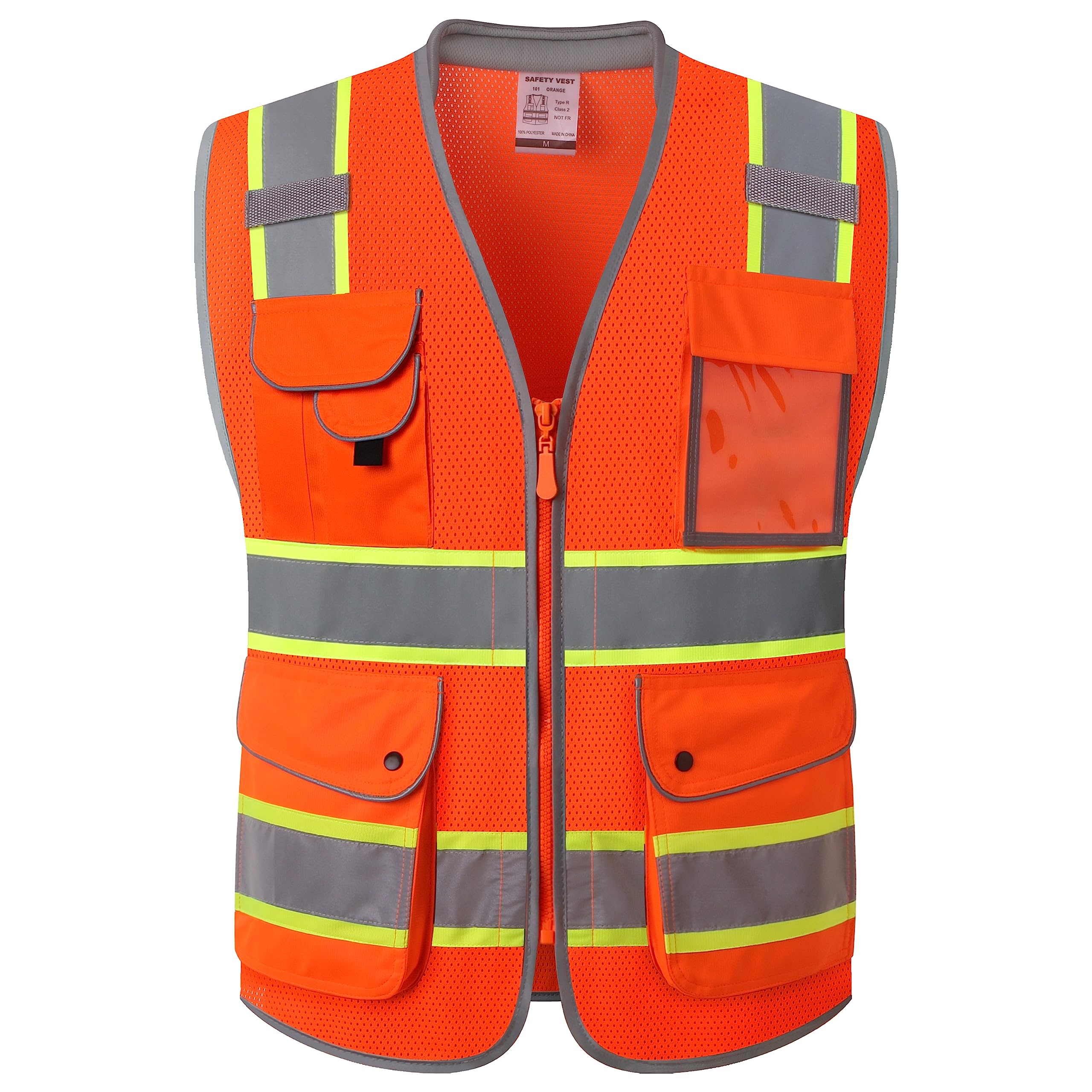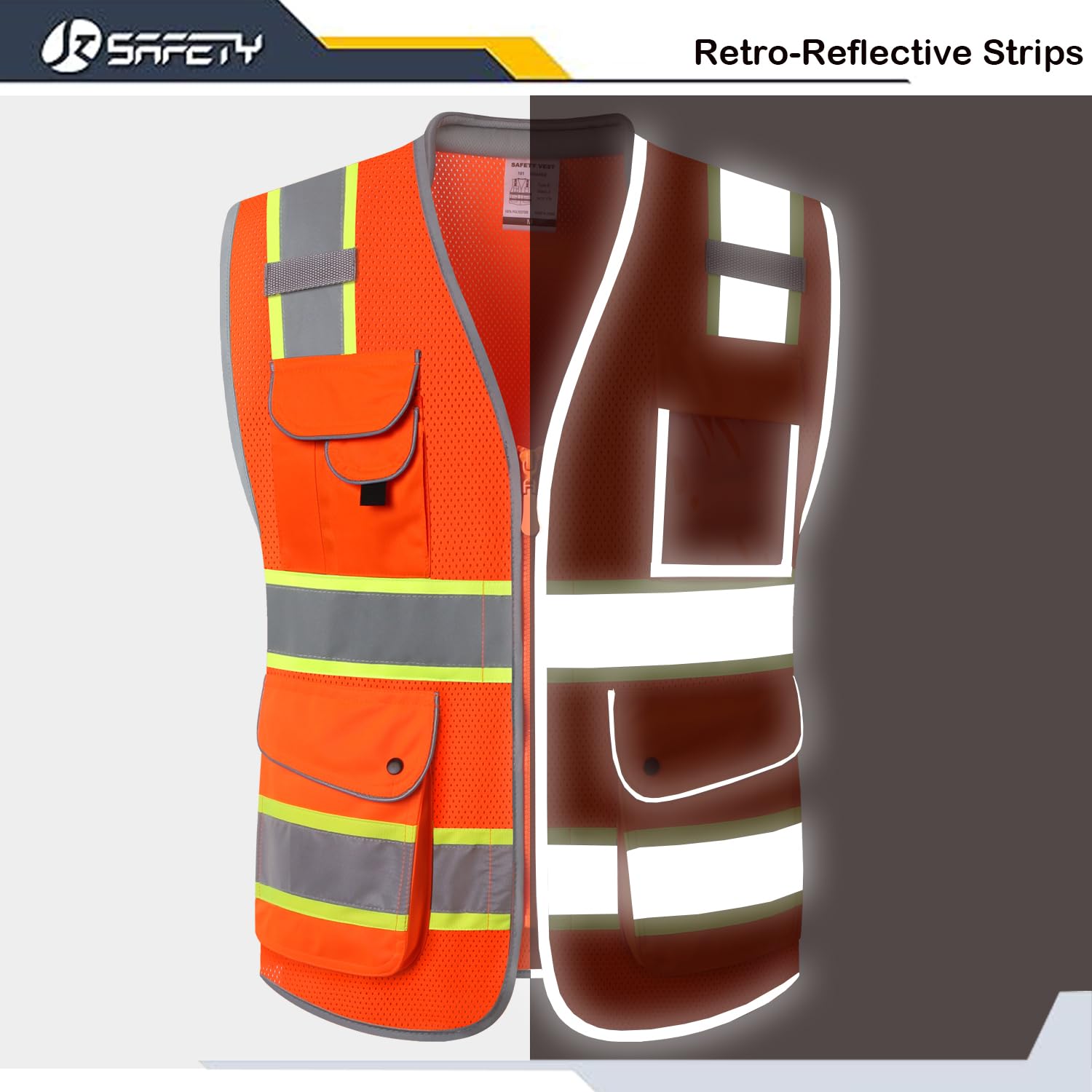 A total of four 2-inch wide high reflective tapes outlined by extended fluorescent color strips are used to maximize visibility. These strips are certified by a laboratory for their reflectiveness and compliance with ANSI and OSHA safety standards. They cover the shoulders, chest, and back, glowing when in contact with any light sources and making you visible to others at your workplace.