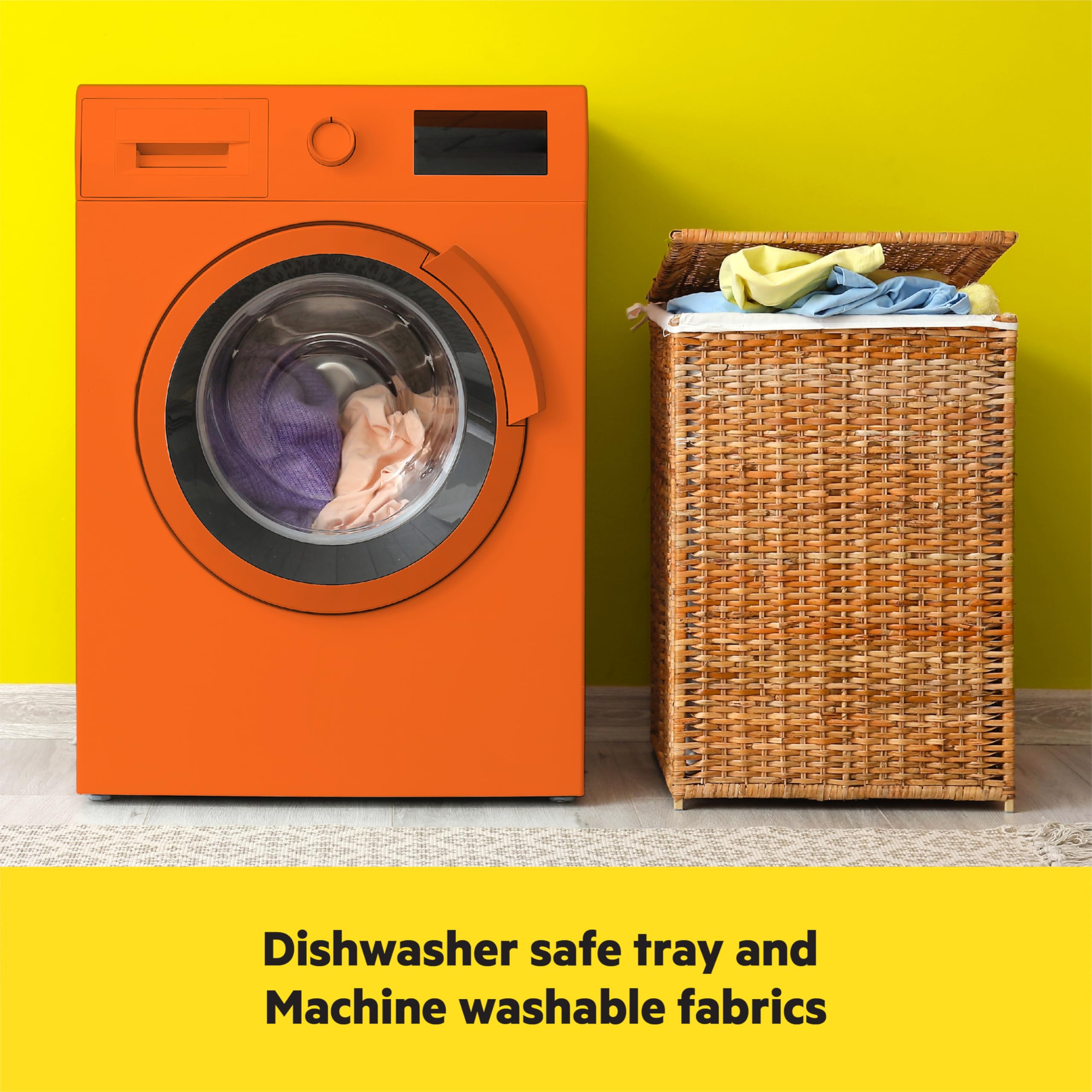 Compact design easily folds to 5 x 15 inches; Easy to clean with dishwasher safe tray and machine washable seat pad; includes a rear storage pocket for little essentials