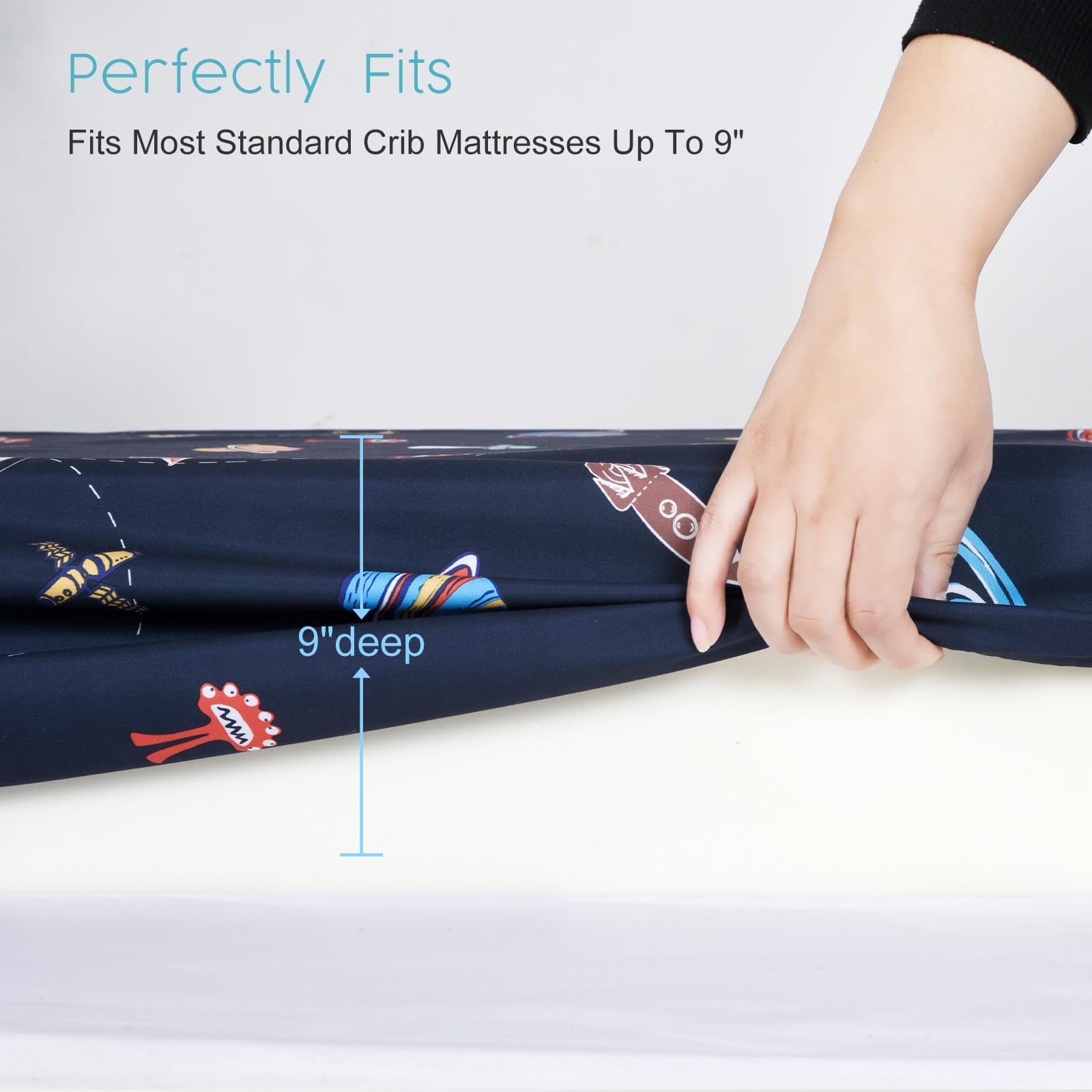 Perfectly Fit: Measuring 28 by 52 inches with 9 inches deep pocket, our crib sheets can perfectly fit standard crib mattress or toddler mattress up to 9 inches. No worry about too loose fit or bunching up the mattress. A whole strong elastic band at the bottom help keep the sheet stay flat right in place securely and snugly to create a safe and comfortable sleep environment for babies.