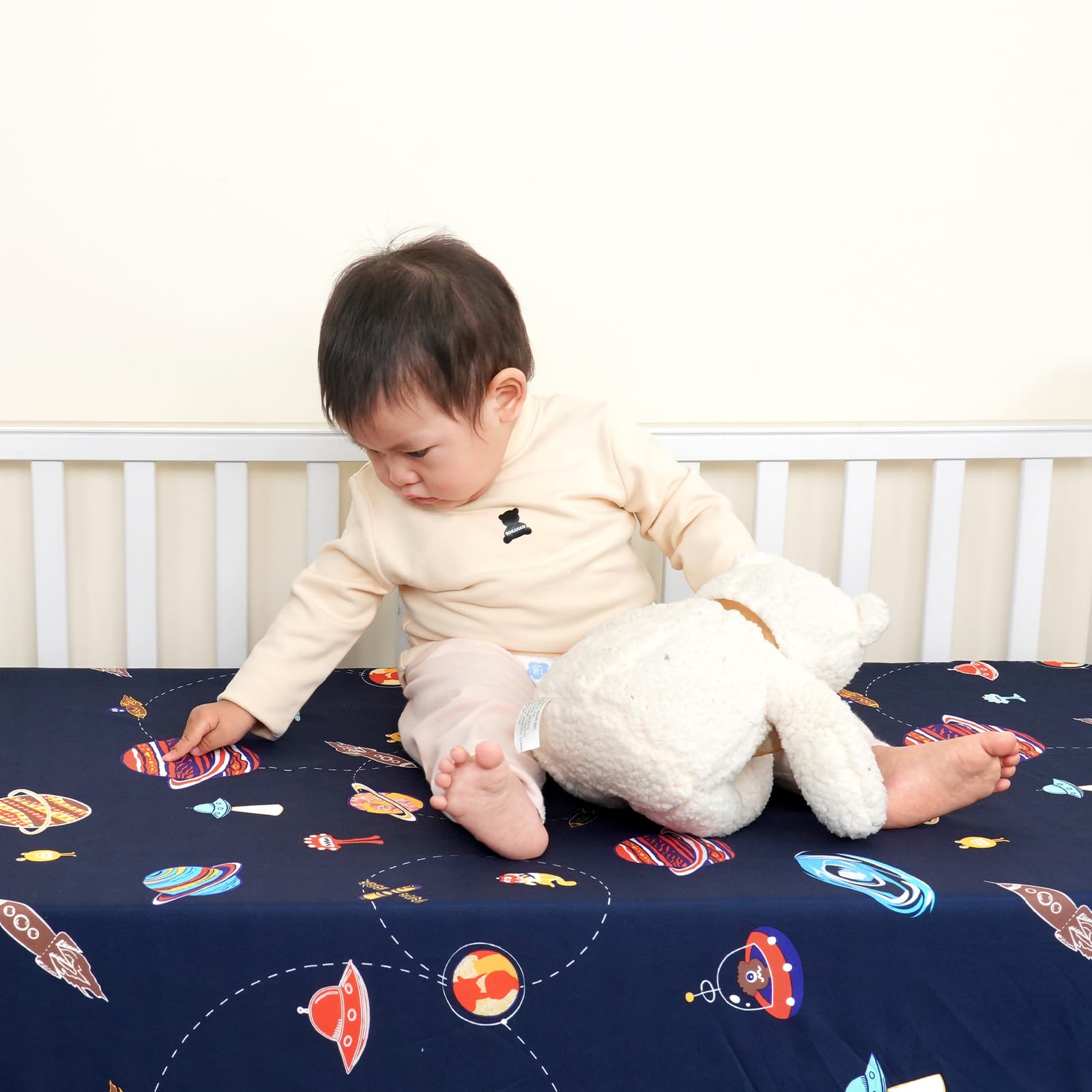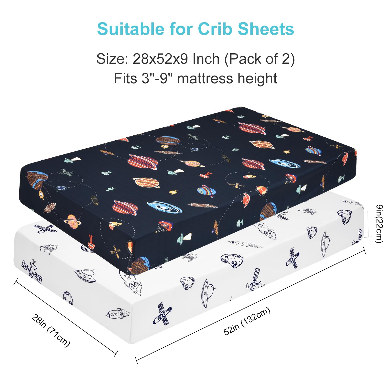 2 Pack Crib Sheets: Pack of 2 fitted crib sheets.There are many planets, rockets, launchers on it, you can use these patterns to exercise your baby's recognition ability and concentration. You can use it as your baby photo background, too. I believe, such a background will make your baby more popular.