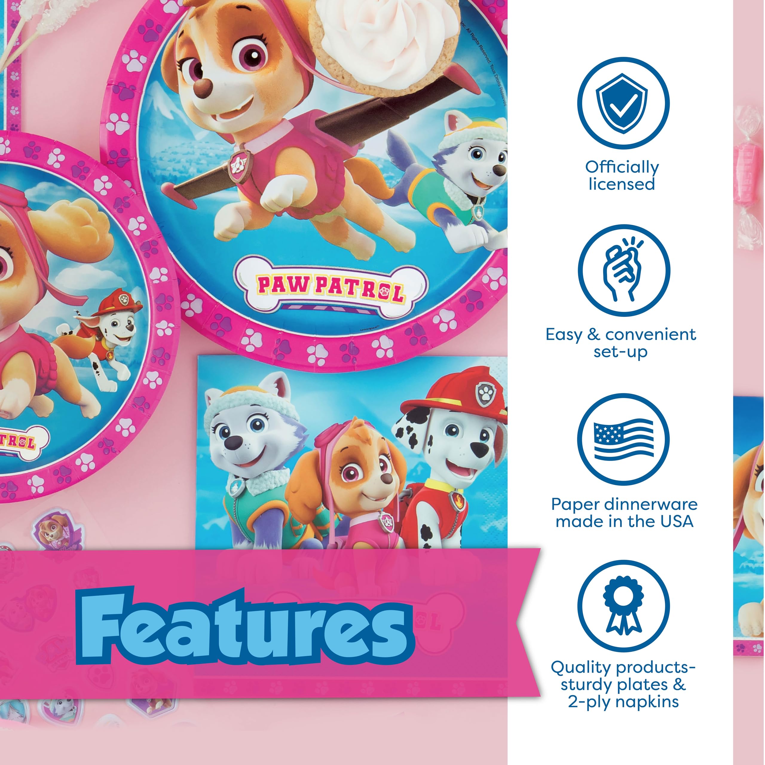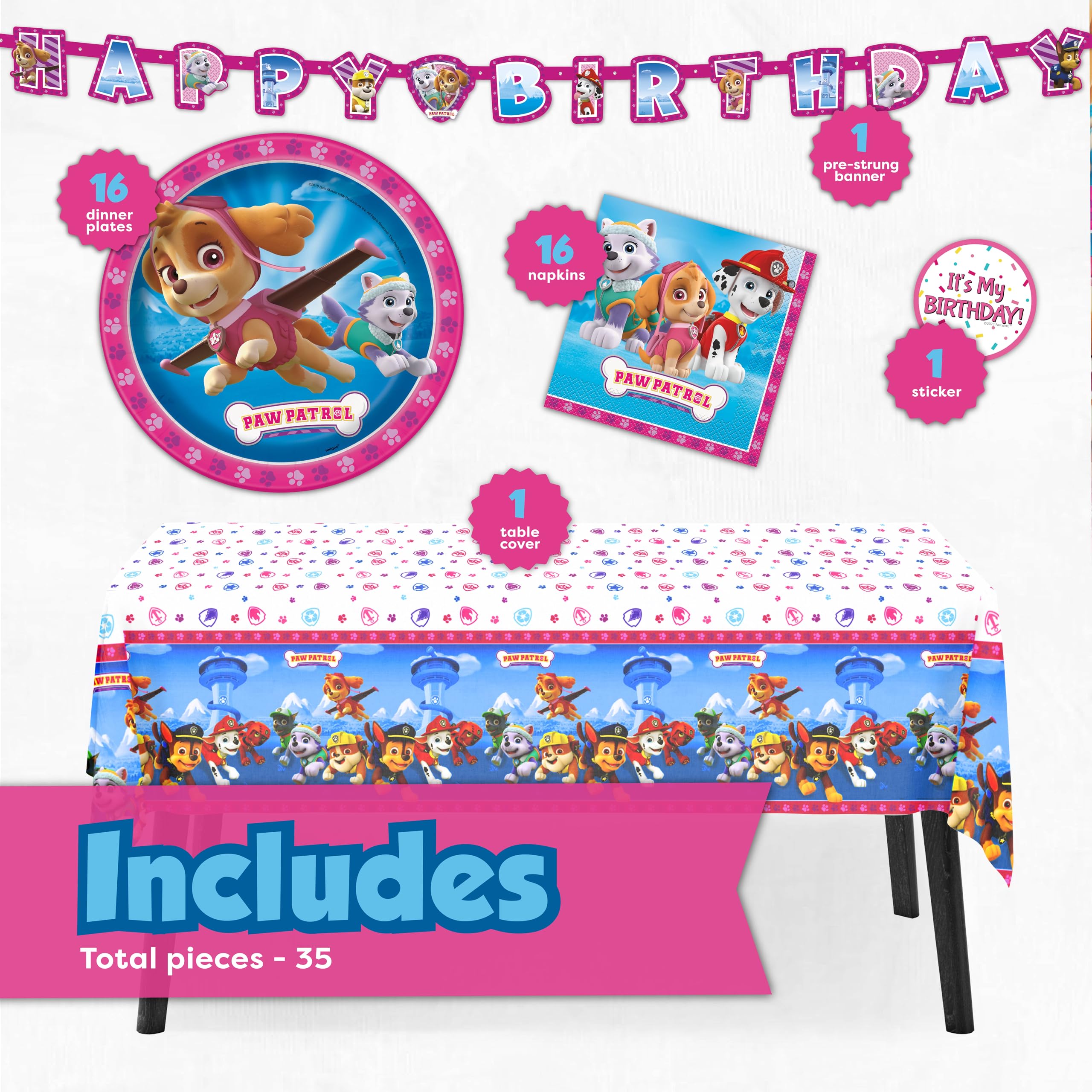 INCLUDES: This Paw Patrol party decorations set includes: 1 table cover, 1 banner, 16 large 9" dinner paper plates, 16 paper napkins, and 1 "It's My Birthday" sticker.