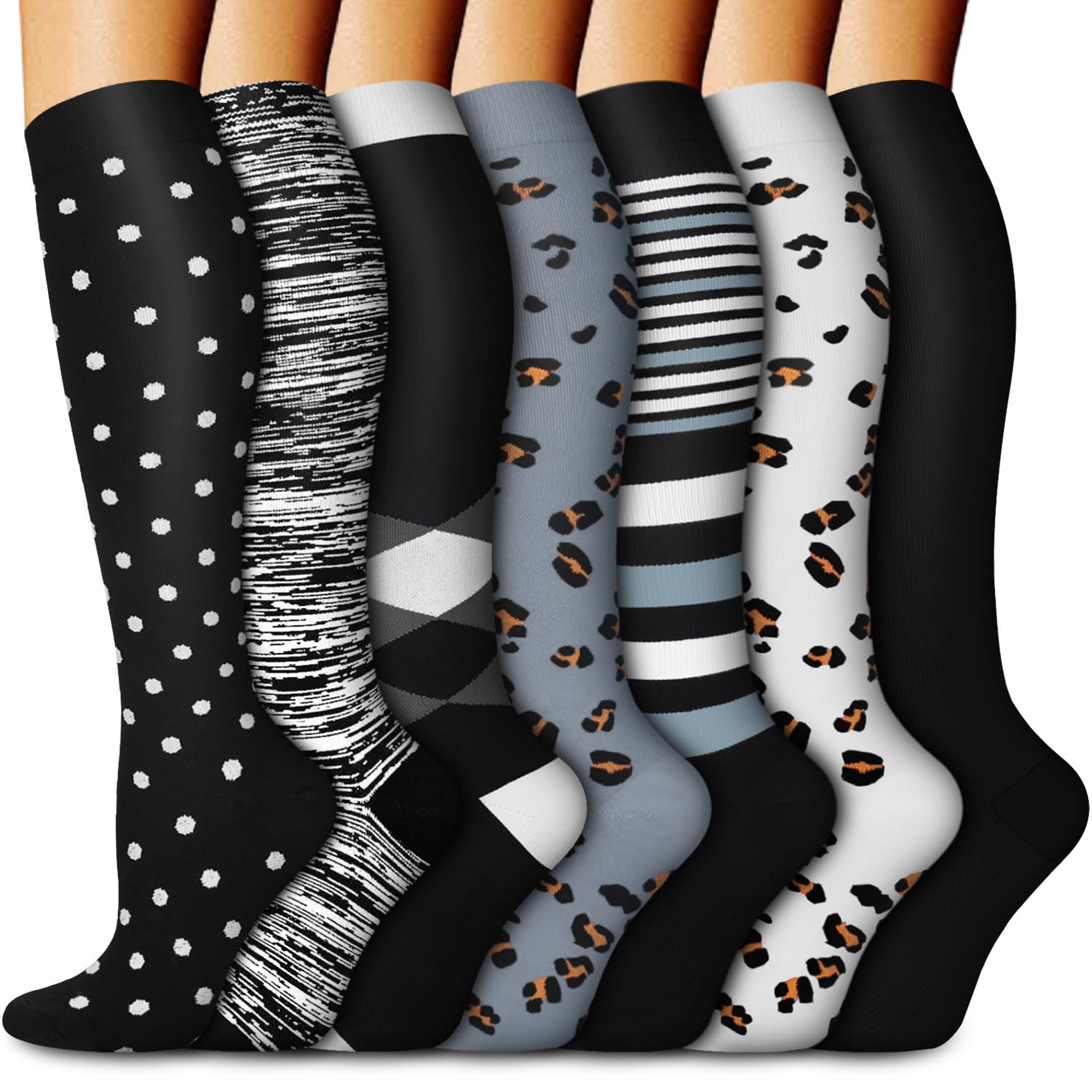 ✔️Fun and Vibrant Designs--If you love to express yourself through fashion, our colorful and fun compression socks are perfect for you. Each pair is meticulously designed with unique patterns that are sure to catch the eye. The reinforced toe and heel areas provide extra support and comfort, making these socks both durable and stylish. Suitable for all occasions, from casual wear to sports and adventure.