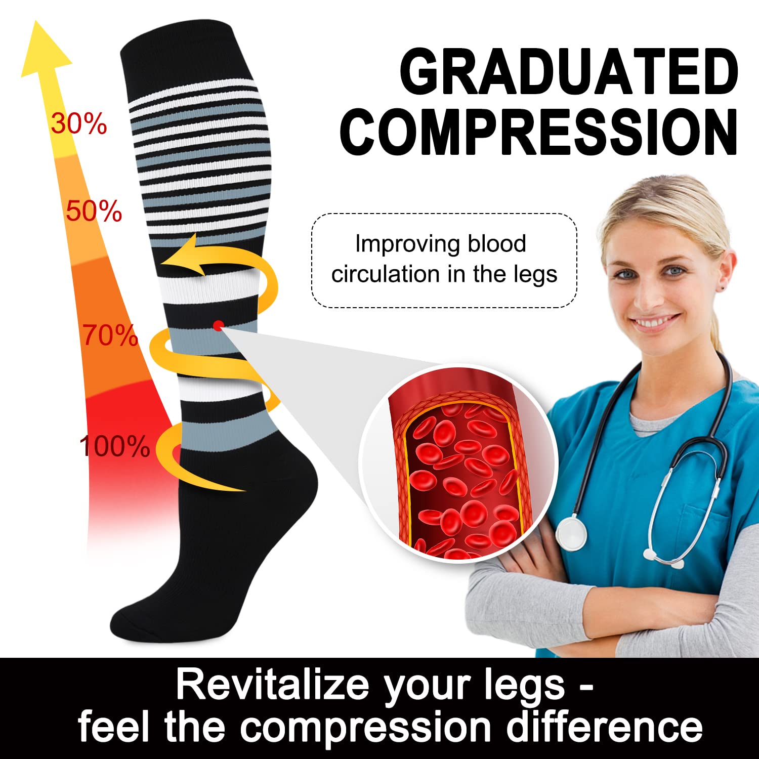 ✔️Medical-Grade Compression--Our compression socks are highly recommended by healthcare professionals and fitness trainers. They provide maximum pressure at the ankle and gradually decrease up the leg, improving blood circulation and alleviating leg pain. The high-performance fabric keeps your feet at an optimal temperature, making these socks ideal for long trips, work, or any activity requiring extended sitting or standing.