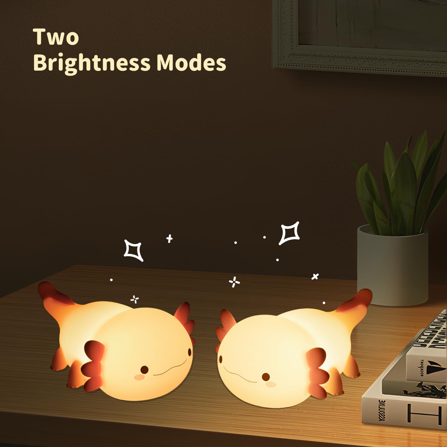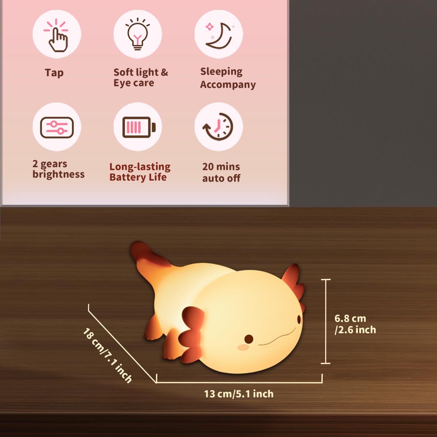 Simple to Use: The axolotl nightlight has built-in 1200mAH battery, long-lasting battery life for your all-night sleep. It has two gears of brightness adjustment, meet the needs of different occasions. Kids night light can be turned on and off by simply squeezing it, making it easy for your child to use at any time.