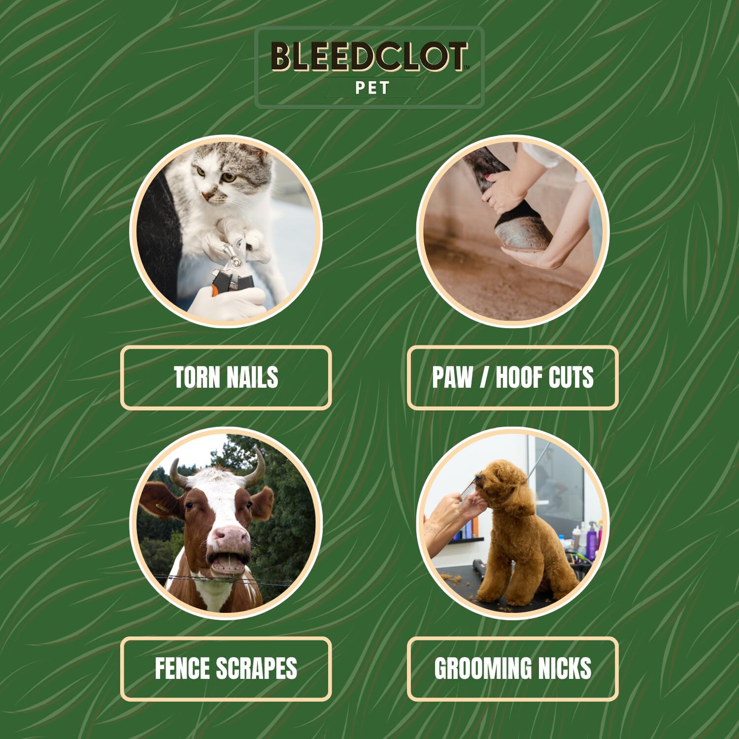 How to Use BleedClot Pet – Pour generously onto the wound and apply firm pressure. Blood coagulates quickly, stopping bleeding immediately. Safe to leave in the wound, making it ideal for dogs, cats, horses, and other animals for fast, reliable first aid.