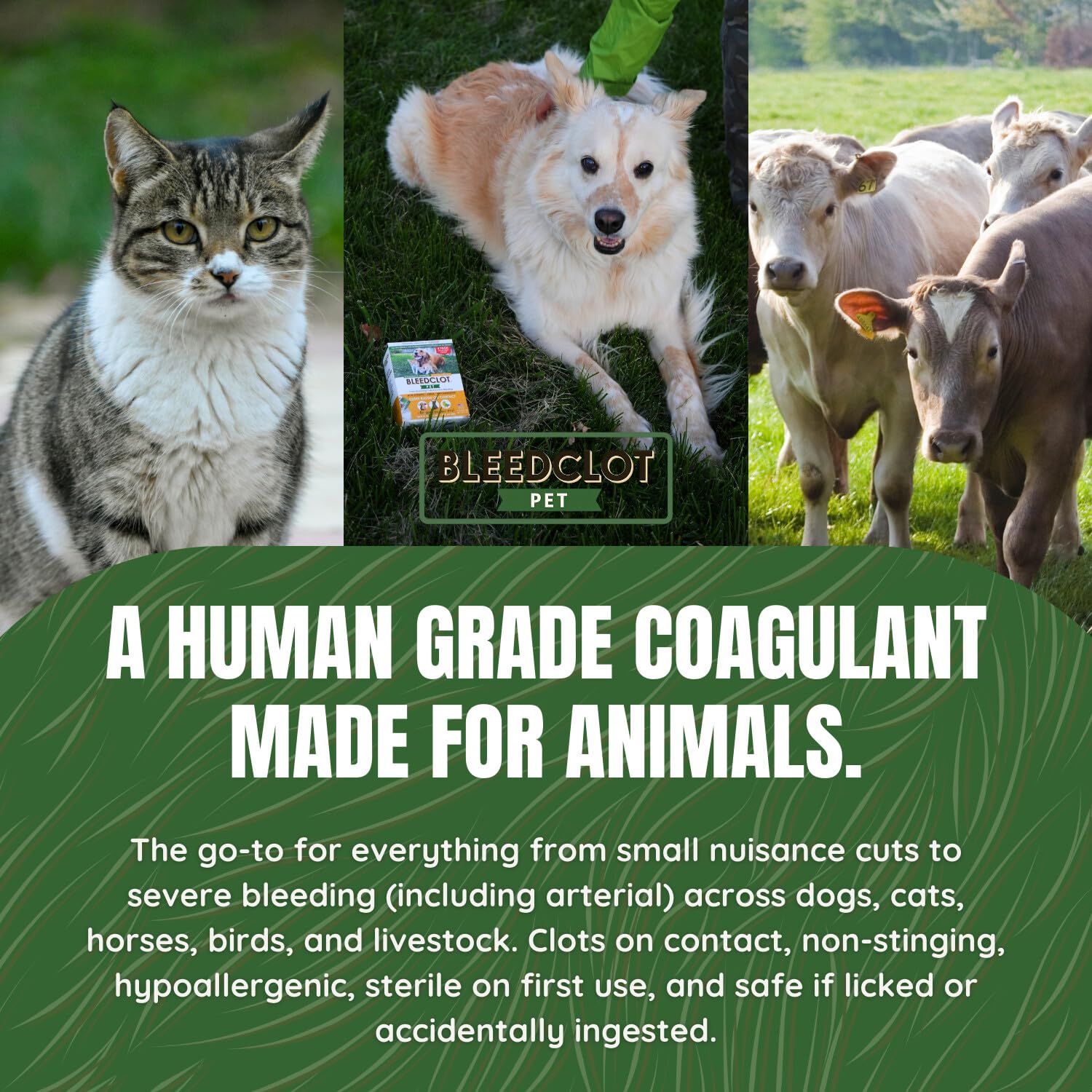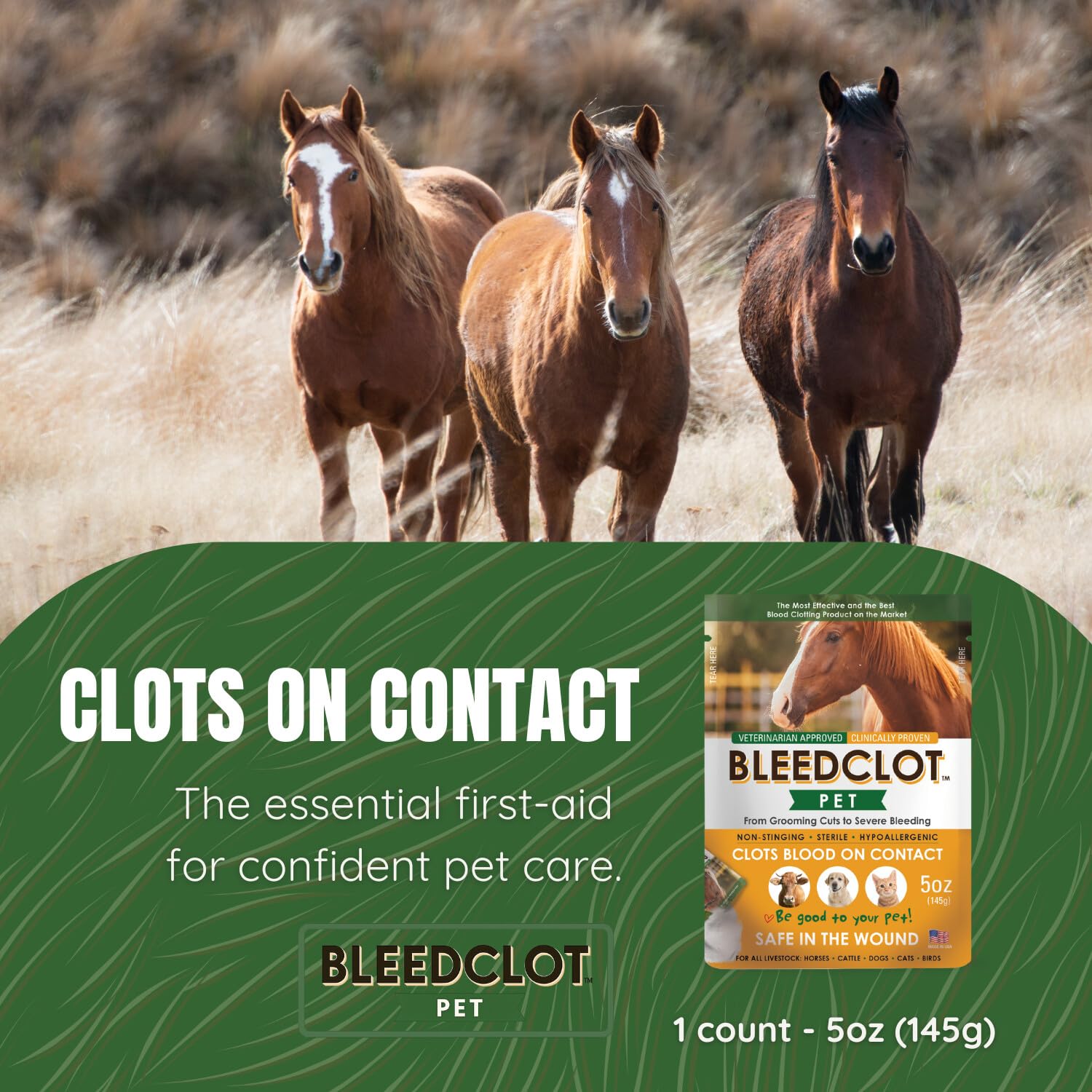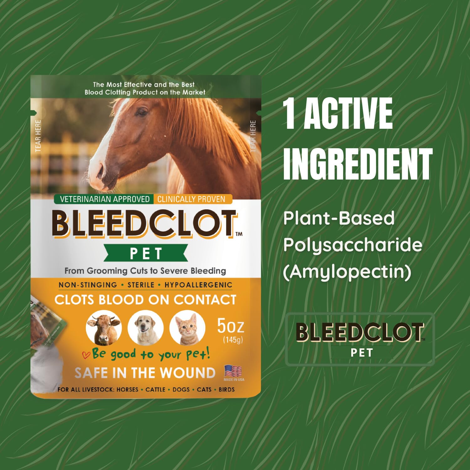 Safe for Pets & Animals – BleedClot Pet First Aid Powder is sterile, hypoallergenic, and non-stinging, and the only blood clotting powder that pets can safely lick or ingest, making it ideal for dogs, cats, horses, and other animals.