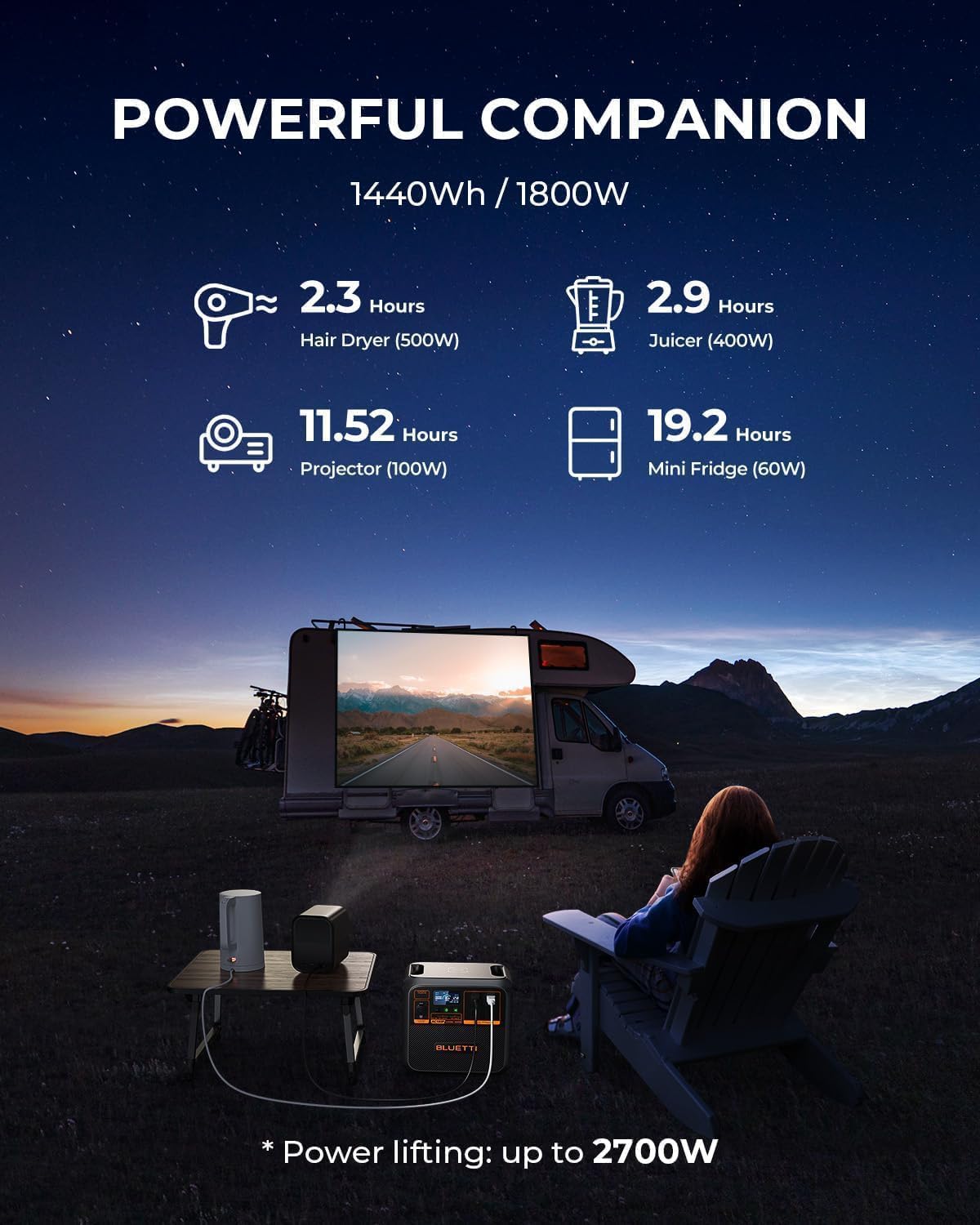[Power All Your Devices] - The AC180P delivers 1800W of steady output with 11 outlets to power nearly all your gear. With a quick tap on the BLUETTI App, you can unlock up to 2700W for high-power devices.