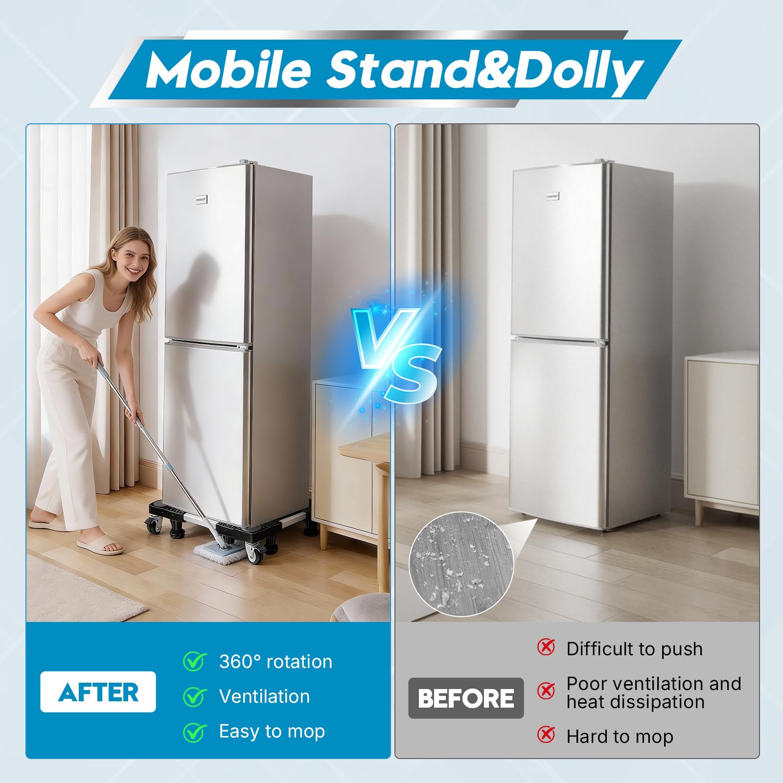 Sturdy and Durable: Crafted with 4 robust stainless steel tubes, 4 premium PVC panels, 4 reinforced support feet, and 4 silent wheels with brakes, the fridge stand ensures durability and exceptional load-bearing capability. Say goodbye to worries about corrosion or wear and tear!
