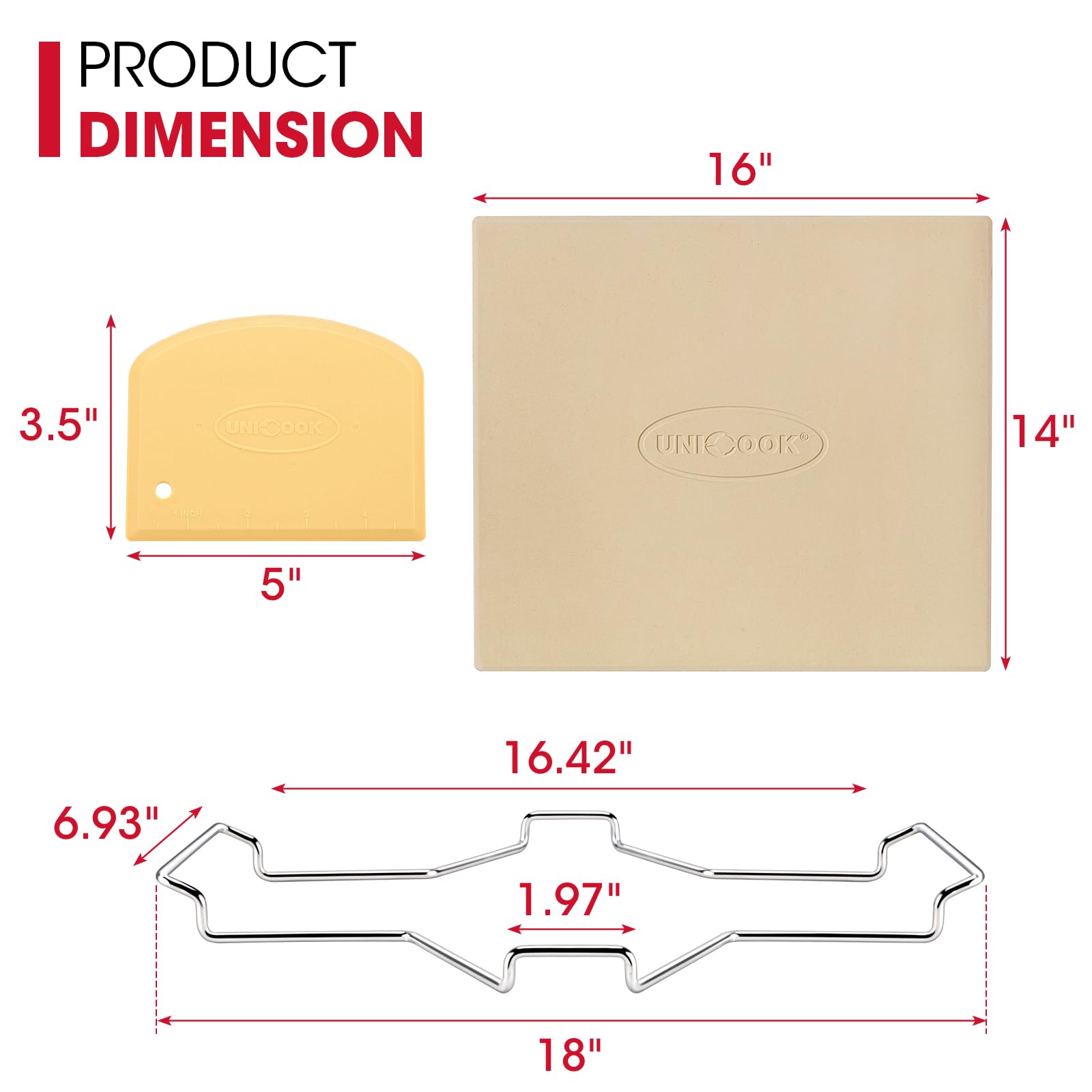 16” Rectangular Baking Stone: The stone measures 16" x 14" with thickness of 0.47”(12mm). It is made of Cordierite and heat resistant up to 1,450℉(787℃). Be sure to measure your grill and oven's interior and choose a stone that fits comfortably with at least 1 inch of clearance on all sides
