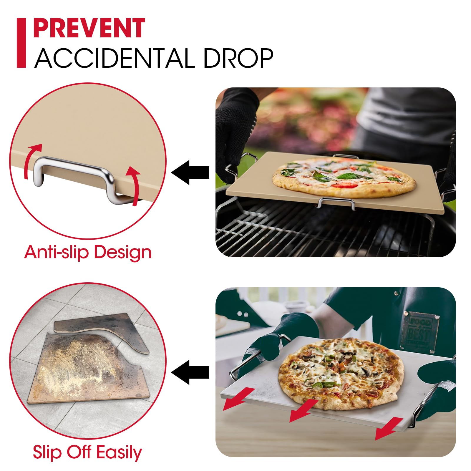 Dual Purpose Stainless Steel Rack: This convenient carry rack allows for easy transport of your pizza. The anti-slip design securely holds the pizza stone in place, preventing it from sliding off. When placed in the opposite direction, it can also be used as a serving stand