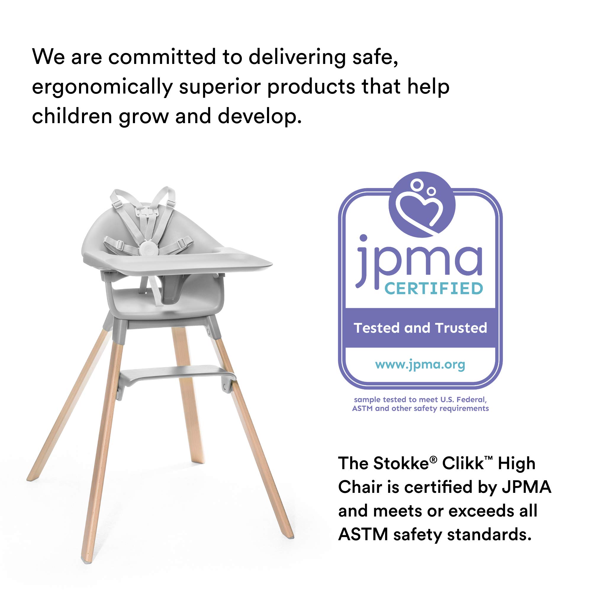 JPMA CERTIFIED - We ensure the utmost safety & care when designing and manufacturing our products. The Stokke Clikk High Chair is certified by JPMA and meets or exceeds ASTM safety standards.
