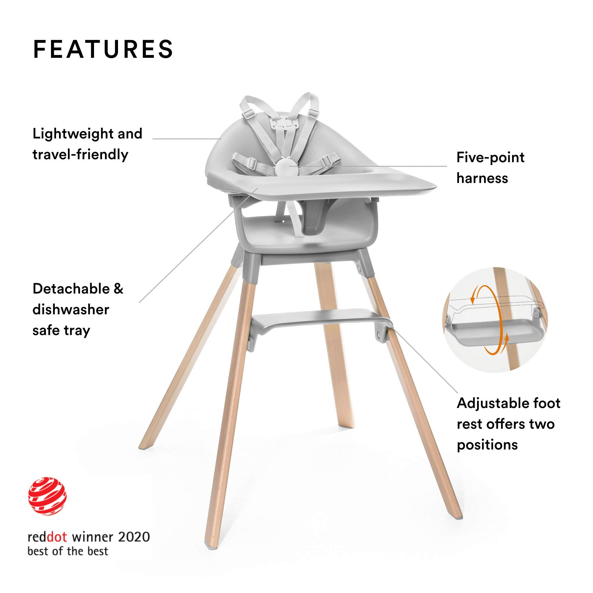 ALL-IN-ONE - The Stokke Clikk High Chair addresses every parentβs needsβall in one box! Get ready for easier, cleaner mealtimes in just 1-2-3 Clikk. Includes high chair, tray & five-point safety harness. Plus, itβs light, durable & travel friendly.