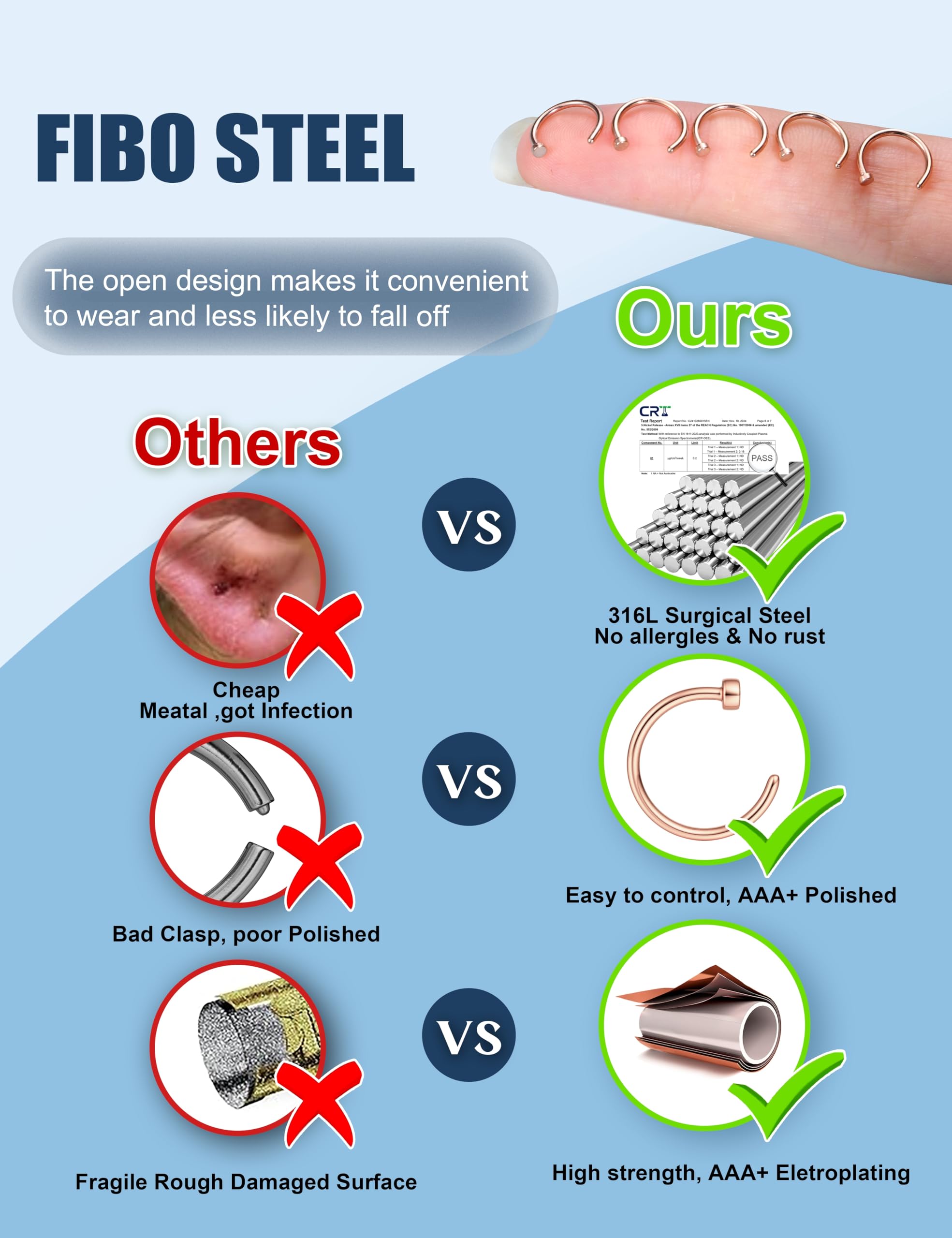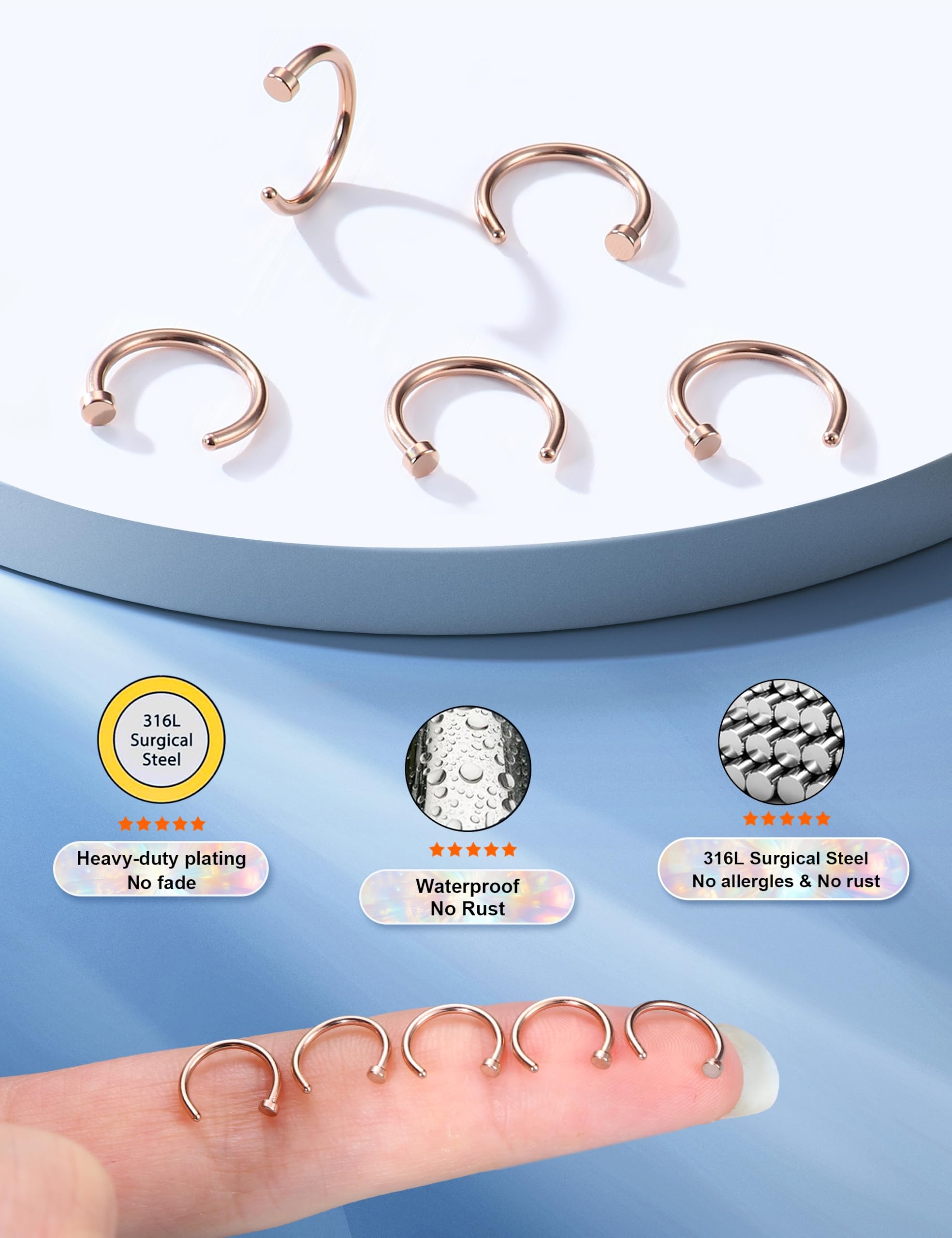 Surgical Steel Nose Rings--Made Of Healthy Safe 316l Stainless Steel,Safe Material; Durable Long Service Time,Comfortable And Non-Allergenic.High Polish Smooth Surface, Comfortable To Wear; Strict Electroplated Process, Insure Well-Distributed Color Plated And Lasting Color Retention.