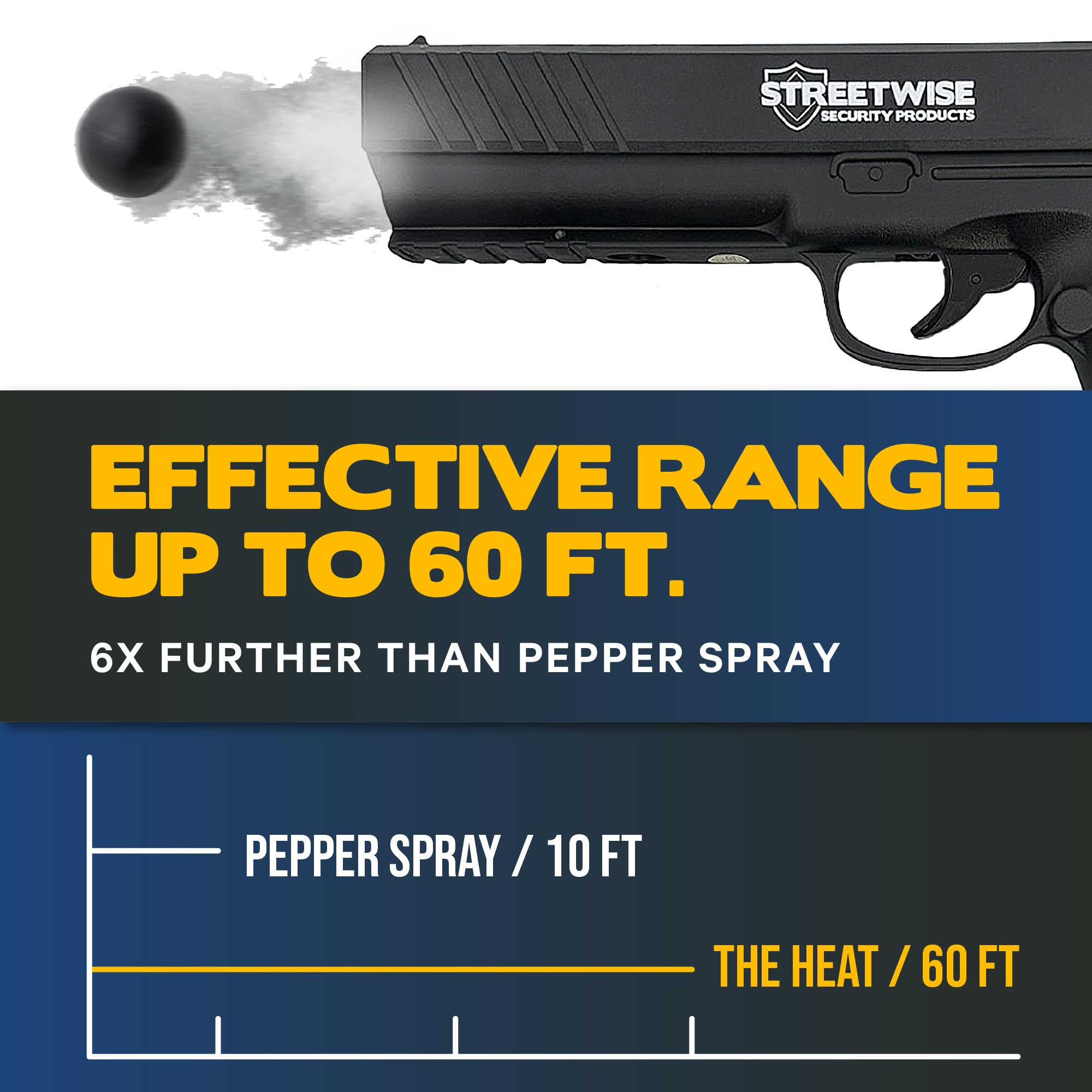 Effective Range - Unlike other personal protection, the Heat allows you to maintain a safe distance with an effective range of up to 60 feet. Irritant rounds burst on impact, creating a 6 foot cloud, ensuring perfect aim is not necessary.