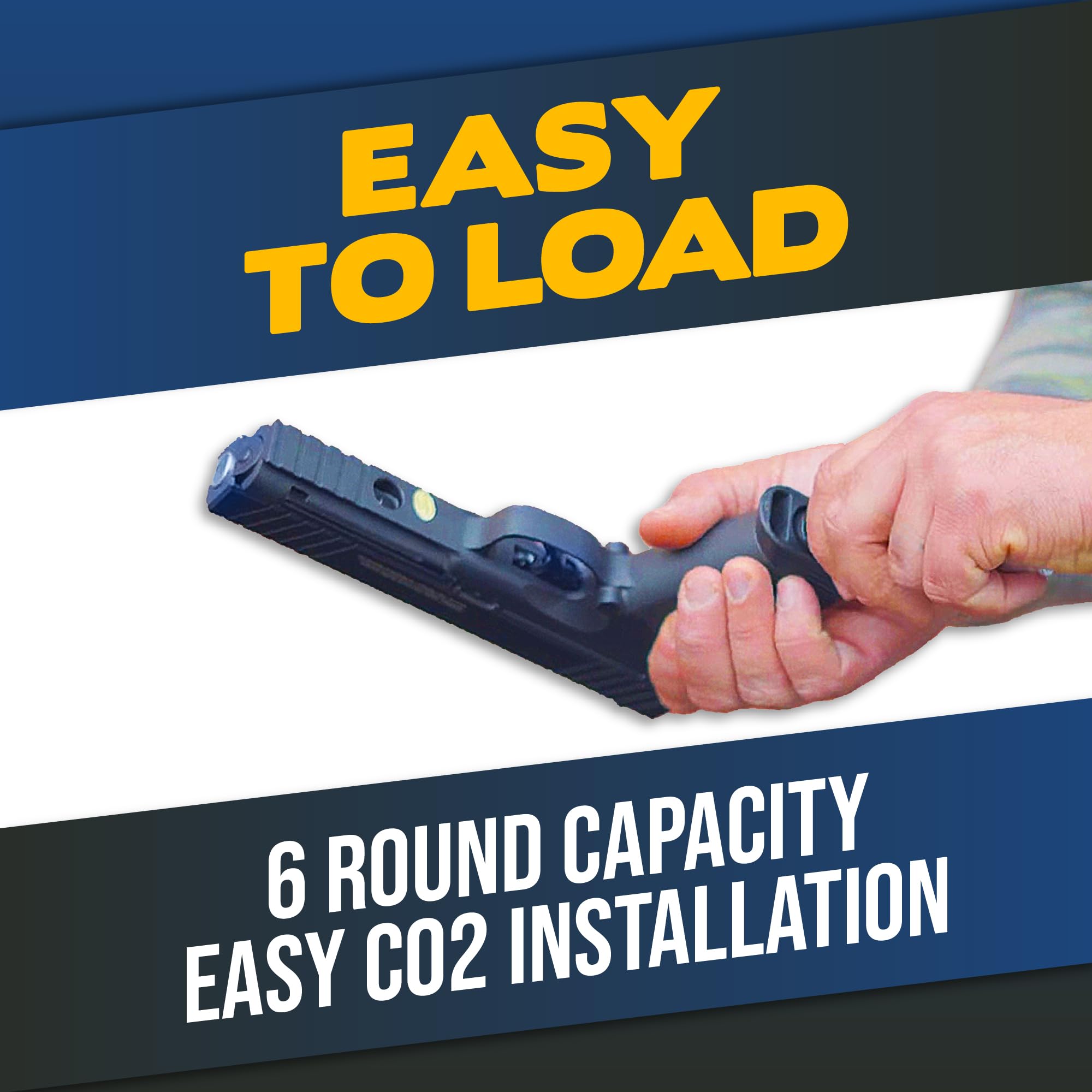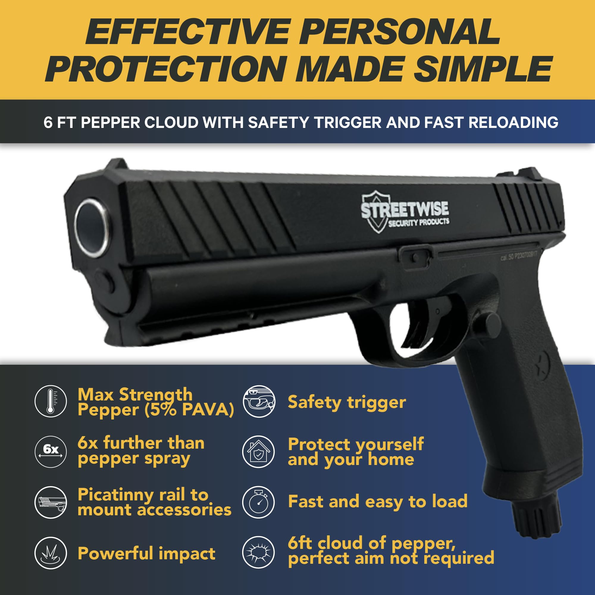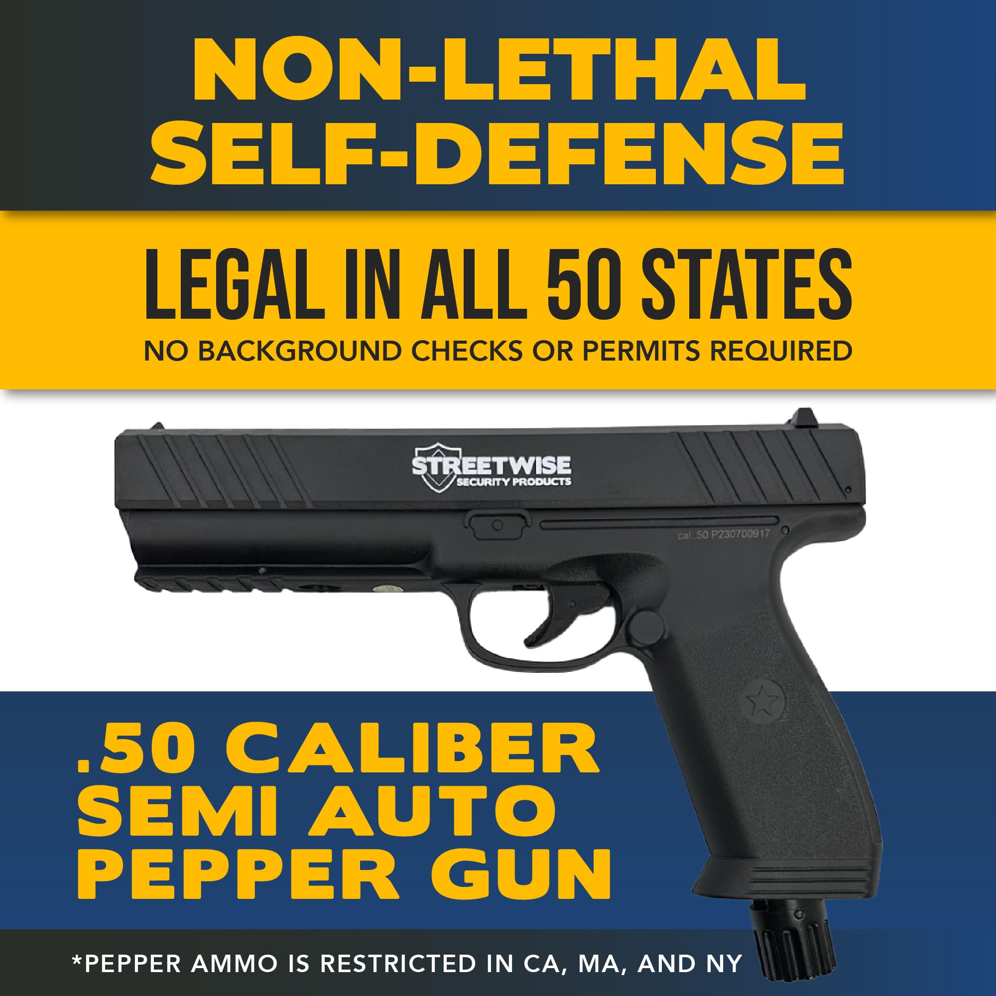 Versatile Ammunition Options - Compatible with .50 caliber defense rounds, rubber balls, and other non-lethal projectiles, making it adaptable to various defense needs. Includes 10 rubber balls, 10 irritant rounds (5% PAVA), 10 Quicksilver (metal composite) rounds, and 2 12g CO2 canisters.