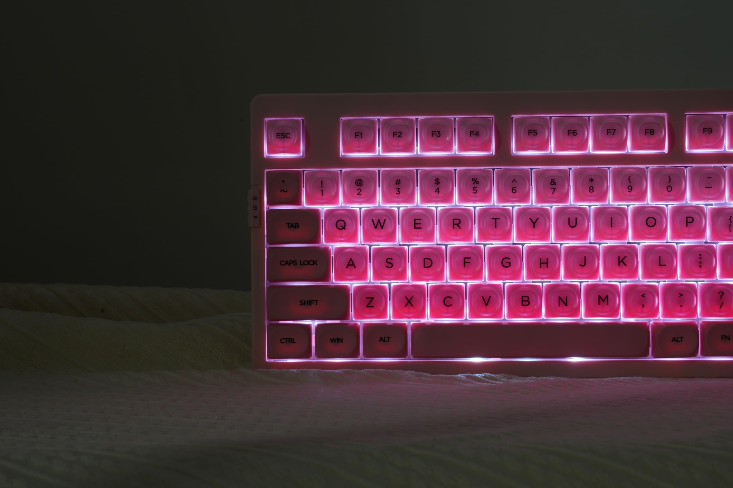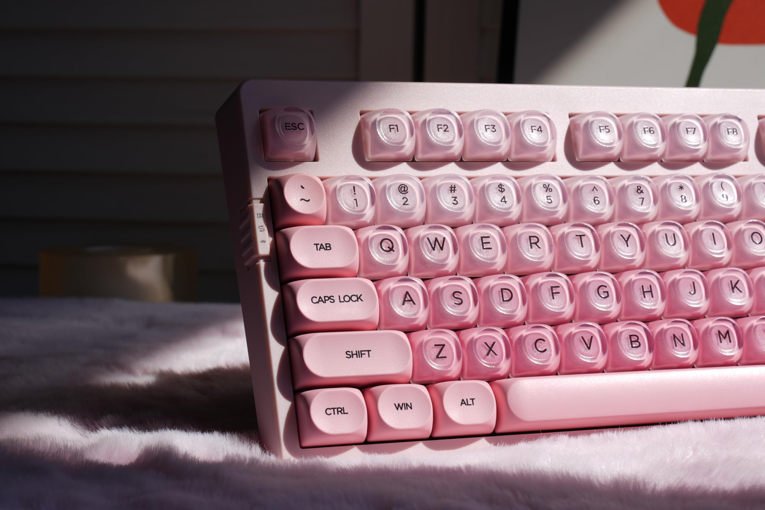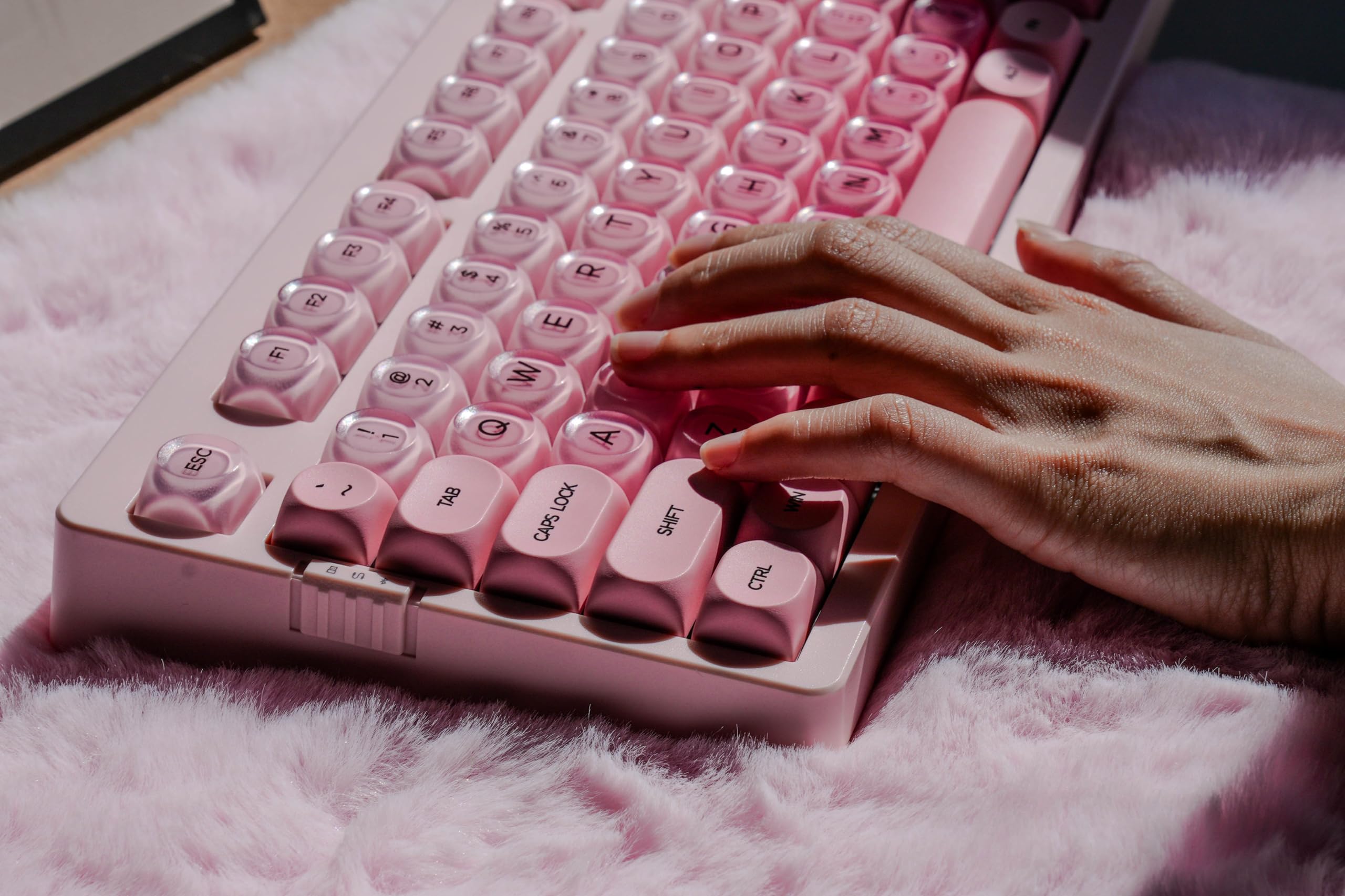 【RGB Lighting with 22 Preset Modes】With Pink case,You Can Enjoy vibrant RGB lighting with 22 preset modes, including south-facing LEDs and edge glow. Combined with high-transparency keycaps, the keyboard creates an immersive, stylish setup right out of the box.