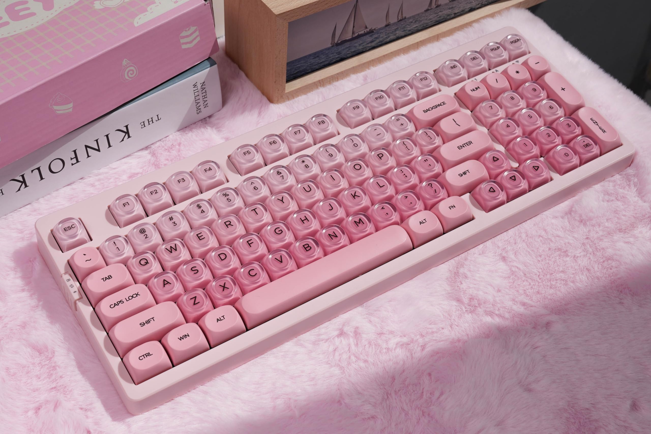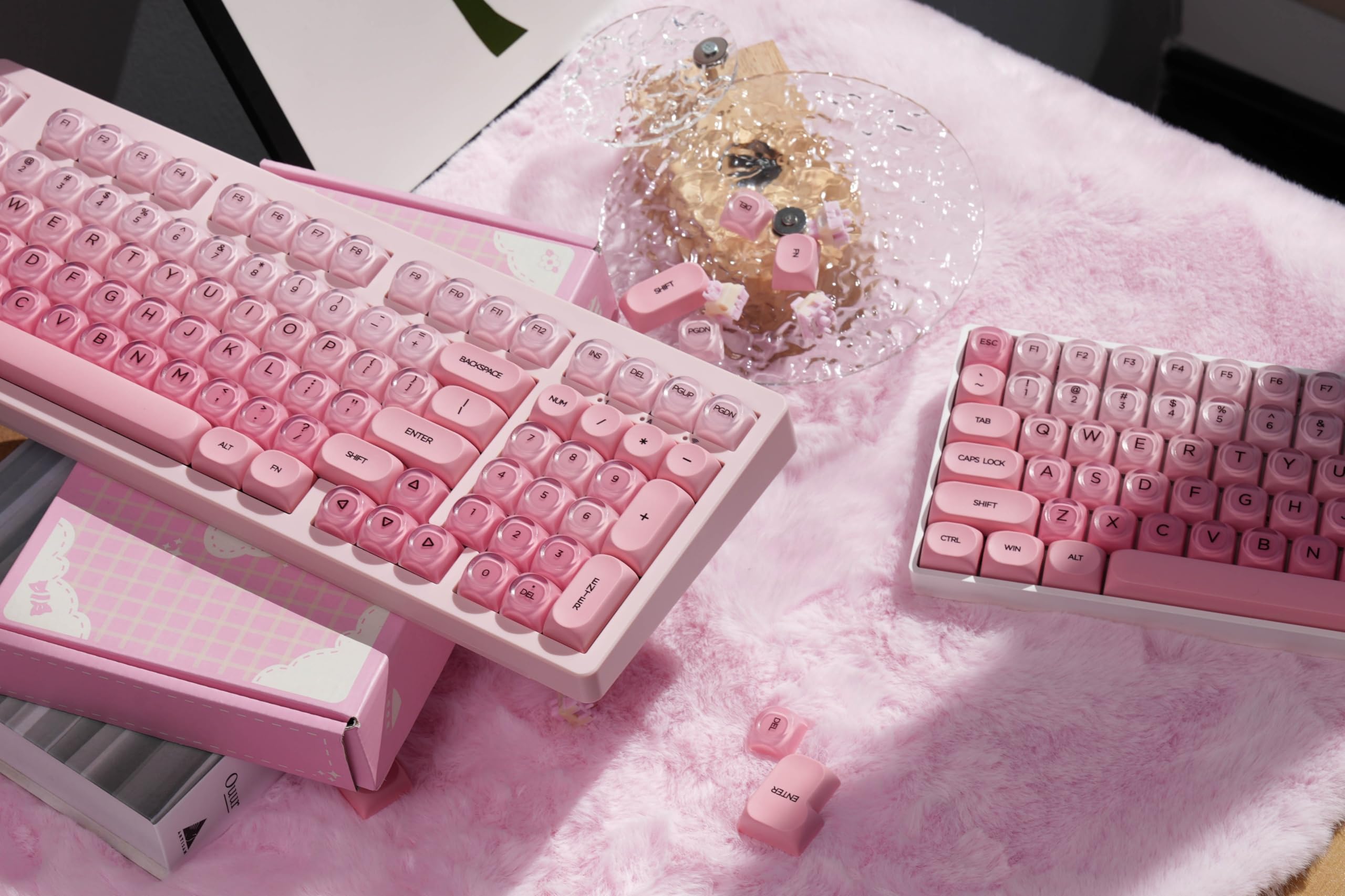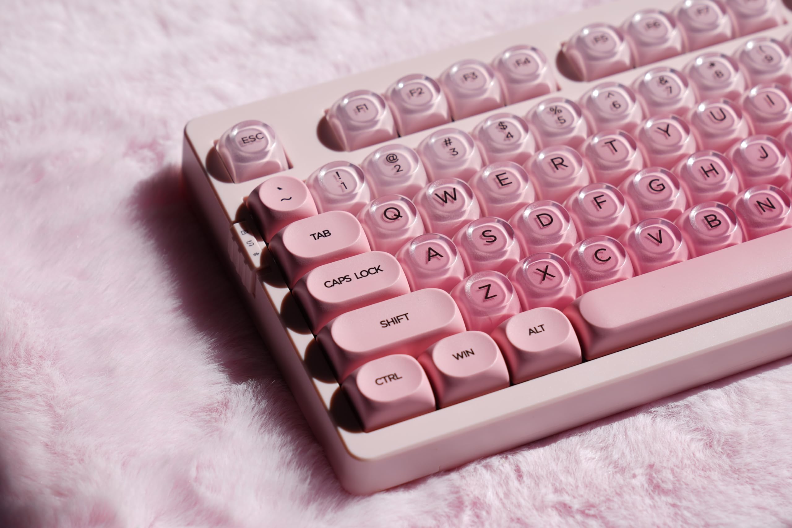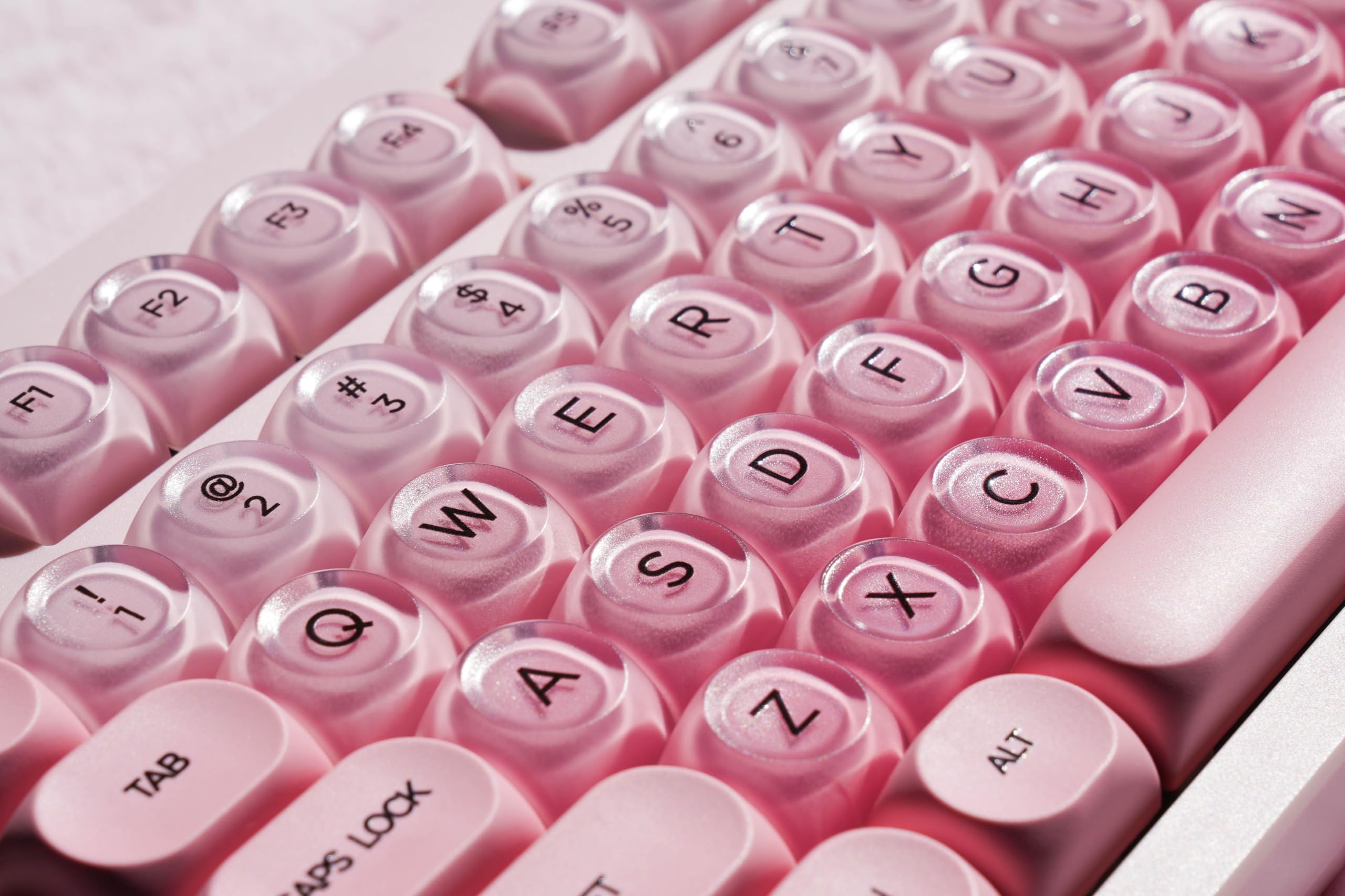 【PBT & Ice Jelly Gradient Keycaps】The charming keycap combines PBT and PC materials with double-shot molding technology. The PBT components ensure excellent wear resistance, substantial thickness, and lasting durability, while the PC elements bring an eye-catching ice jelly - like transparency with pink gradient hues, reminiscent of the otherworldly Pink Beach. Together, they boast a precise finish that repels dirt and stains, guaranteeing long - lasting performance and captivating visual appeal.