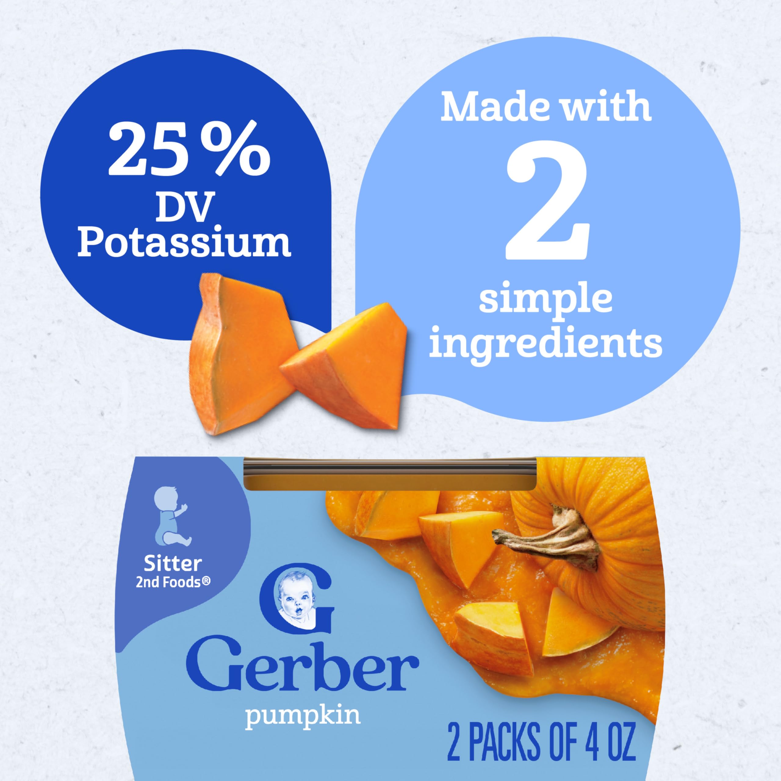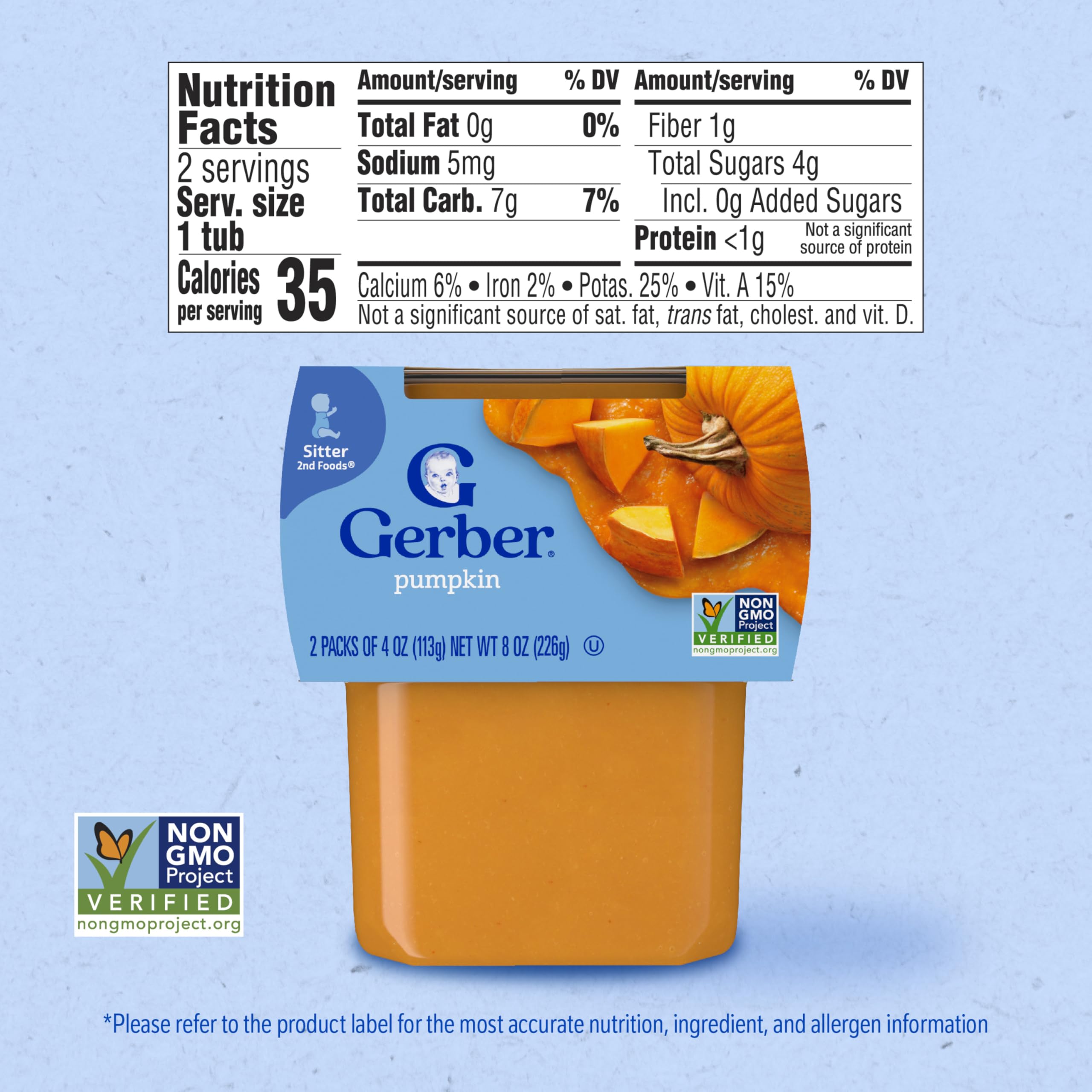 Gerber Stage 2 Baby Food, Pumpkin Puree Tubs are a premium choice for your child’s early stages. Crafted to help support their nutritional needs, along with meeting the busy lifestyle needs of caretakers and parents. Each baby puree tub comes in a portable, easy-to-store format – making it perfect for life’s busy moments. This stage 2 baby food puree is designed for babies who are 6 months + and are ready to explore new textures and flavors. Gerber understands the importance of providing wholesome ingredients during the crucial developmental stages of your child's life -- that’s why our baby puree is Non-GMO Project Verified. Gerber baby puree is ideal for parents who seek a convenient and high-quality option in their baby's diet. These tubs need to be refrigerated after opening and must be used after 1 day.