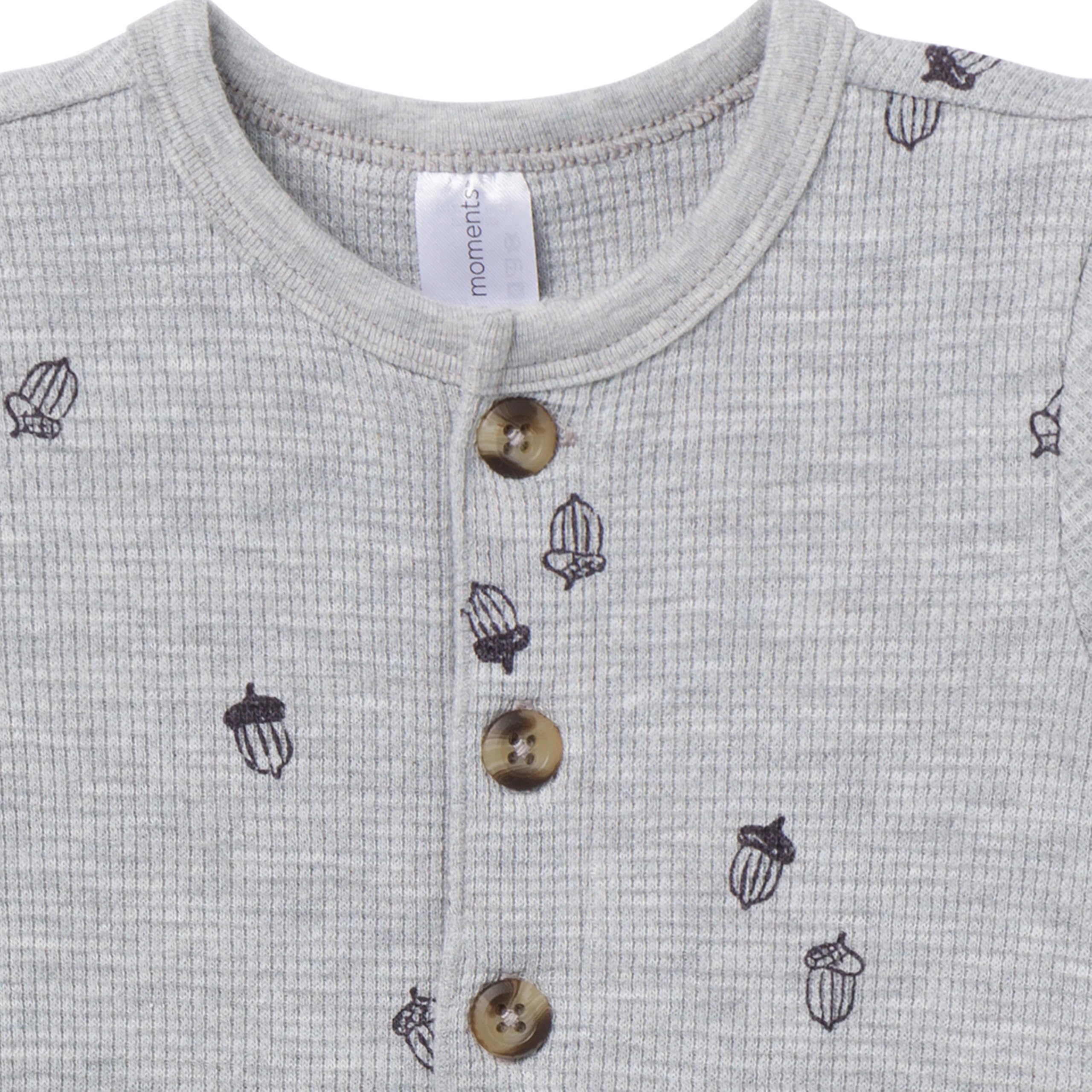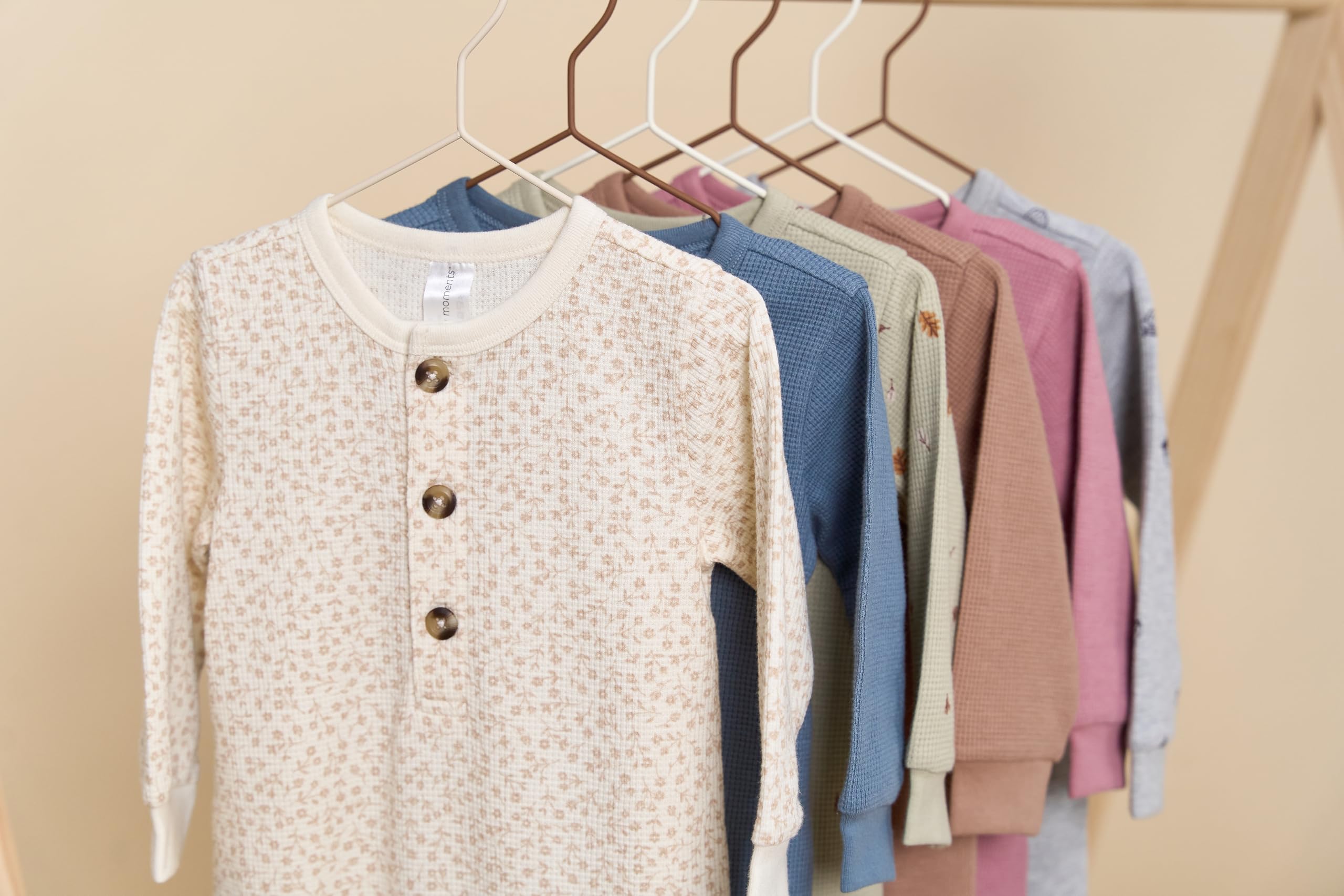 Description Made from warm and cozy mini waffle knit fabric, our baby or toddler romper is designed with both comfort and style in mind. Simple snaps make dressing and diaper changes easy, while the rounded, ribbed neckline provides extra comfort. To ensure a flexible fit for your active little one, stretchy ribbing at the ankles and wrists moves with them while at play. Finished with faux horn buttons for a touch of elegance, this romper is perfect for keeping your little one snug and fashionable all day long.