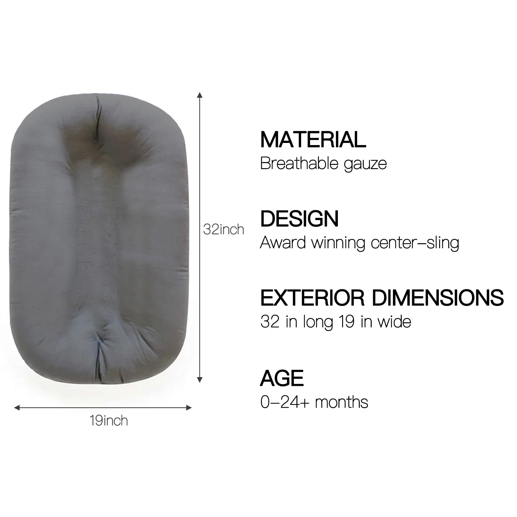 ❤ Fits 0–24 Months Great for babies 0–24 months. Transition to Toddler Lounger when baby is 10+ months, 24" from head to bum (no feet), and a confident crawler who self-adjusts.