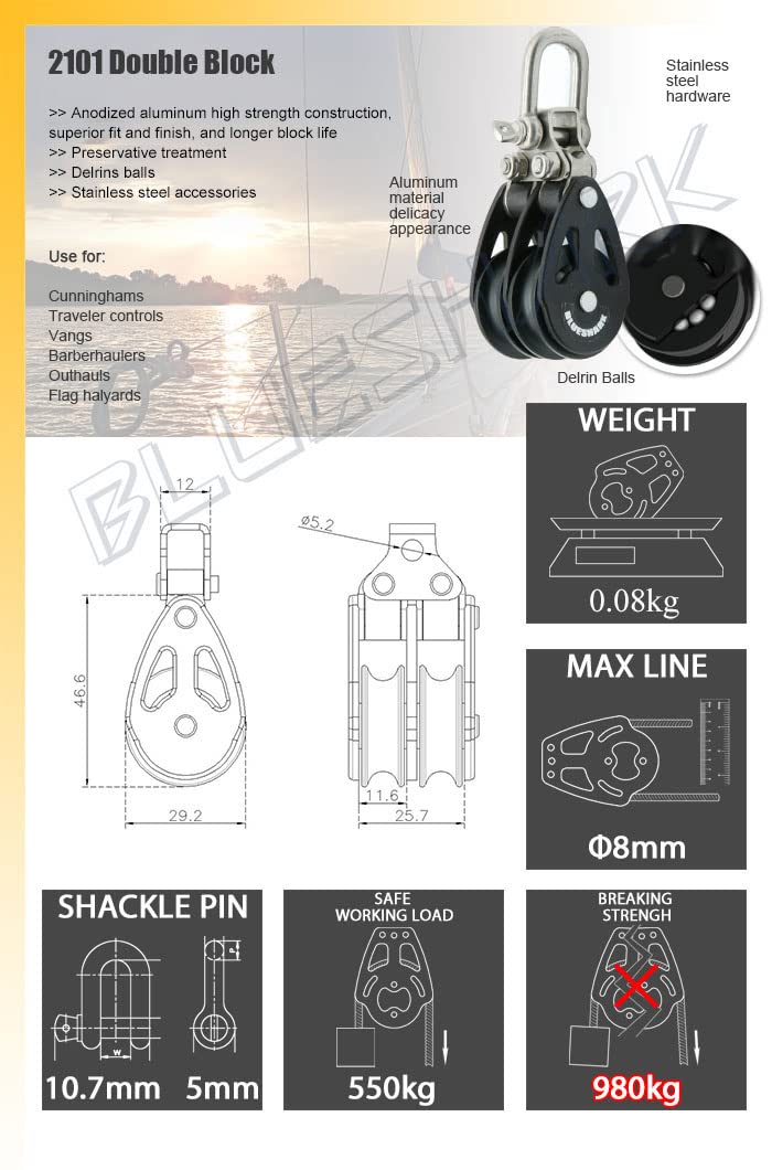 >>Aluminum material with high strength, delicacy appearance,longer block life ------------------------ >>Preservative treatment ------------------------ >>Delrins balls ------------------------ >>Stainless steel accessories. Use for: Cunninghams;Traveler controls;Vangs;Barberhaulers;Outhauls;Flag halyards