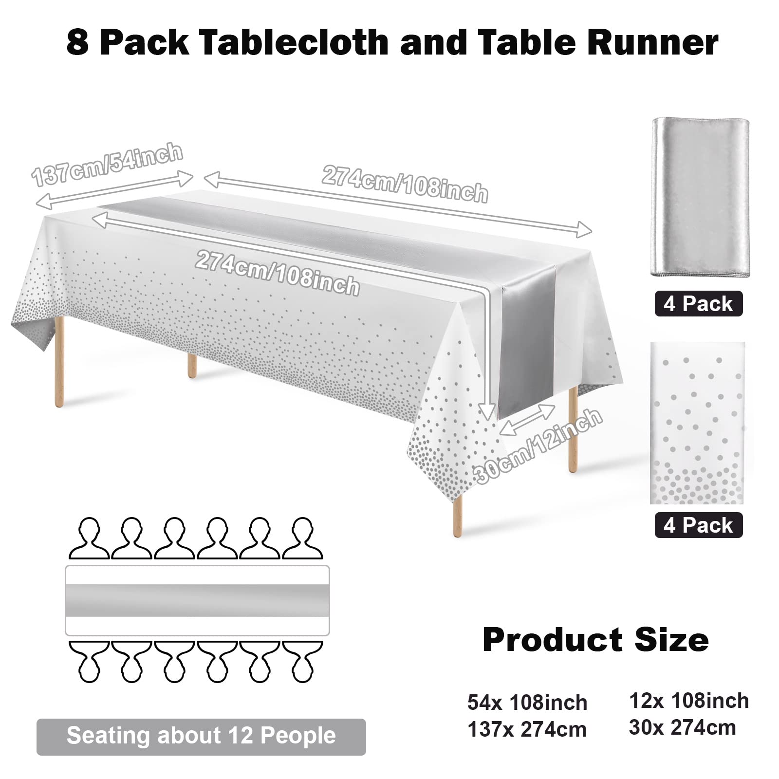 What you will get: the package includes 8 pcs white and silver confetti dot plastic tablecloth and 8 pcs silver satin table runner, specific color as the picture shown, nice combination for you to use in daily life or important occasions enhancing the atmosphere for your event.