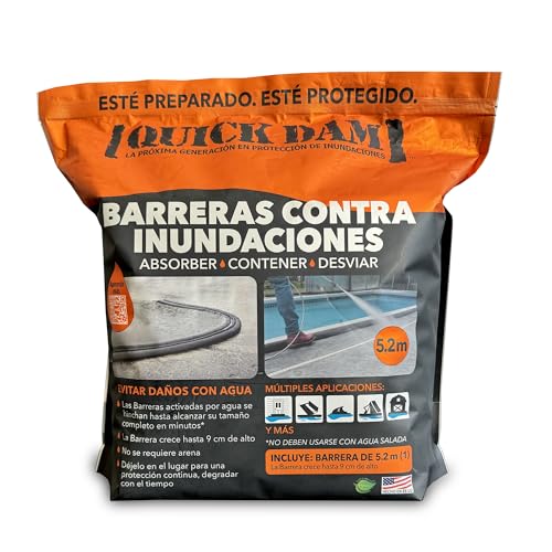 Product Description Quick Dam Flood Barriers Patented Water Activated Flood Barriers absorb, control, & divert flood water Product Description Protect your home or property in times of flooding with Quick Dam Flood Barriers. Quick Dams expand and activate on contact with water. Just lay them in place and let the water do the rest. Absorb contain and divert problem water away from your home and property, before it becomes a problem. Keep some on hand for emergency situations. Use around doorways, garages, leaking tanks, construction projects, anywhere water is a problem. Protect Against: Storm surges & water main breaks Overflowing appliances & equipment Leaking equipment & water tanks Broken sprinkler heads A/C condensation overflow Spills, leaks, floods, drips & more Water Activated Flood Barriers Just get them wet Grows to a full size of 3.5in high in 10 minutes Contains a super absorbent powder that swells and gels water Swelled barriers contain, control, and divert flood water No need for sand or labor filling product Available in 5ft, 10ft, or 17ft lengths Absorbs 4 gallons, 8 gallons & 13.5 gallons of water respectively How to Use Place the Barriers in the path of oncoming flood water. As they come in contact with water, it will absorb through material & start to swell. Barriers reach their full height of 3.5in in 10 mins if enough water is present. If a rush of water is expected or you need to stack them, pre-soaking them is recommended. Not for use with Salt water. * Place wider section of Barrier towards water, as the smaller section (wedge) prevents it from rolling. **DO NOT want water moving in this direction causing seepage in between the Barriers. Tips & Tricks During first activation, we recommend checking on them to make sure they are directing water as desired. Adjustments may be necessary as landscaping can alter water flow. Barriers should be stacked higher than water level for stability and to prevent them from floating away. Barriers are flexible and can be curved or wrapped. Barriers have a dual chamber, place wider edge towards water & smaller wedge away from water to prevent rolling out of position. Pre-Soaking is recommended prior to stacking or if heavy rain or water flow is expected. Staining may occur in instances where the surface is porous or unfinished cement is present. Remove from area when no longer needed. Porous surfaces like unfinished cement cause excessive seepage, since they are both trying to absorb water. Plastic barrier film in between, may help. For use in the winter/snow months, make sure they are fully activated before freezing temperatures occur to assure maximum protection when the snow is melting. We do not recommend moving them while frozen to prevent any tearing of the outer material. Also, salt on the roads should not come in contact with Quick Dams. To help, pre-activate Quick Dams with water & then wrap plastic under & over the top to prevent the salt from making contact. Do NOT use around salt water, lime or calcium. These will cause the inner absorbent to release the water & deflate the product making it useless. Flood Barriers will not fully activate unless enough water is present. Once activated by water they can be used as a barrier against other oils & chemicals. Leave in place for 3-6 months of ongoing protection. Shrinking will occur as they dry out, but they will swell again once re-exposed to water. Length of time to dry out varies on climate. Average is about 3 months as higher humidity levels tend to take longer. Once completely dry, they will feel crunchy and ready for reactivation. Smooth the contents to evenly distribute the super absorbent polymers. Direct sunlight causes the product to degrade at a rapid pace, which will result in the product feeling slimy. Do NOT cut. The inner contents will be exposed and will make the product unusable. Storage & Shelf Life Barriers unused, have a 5+ year shelf life. Store in sealed bag for maximum term. Keep on hand for immediate deployment. How to Dispose Throw away in trash. Quick Dams are safe: Pet friendly Non-toxic Environmentally safe. Optional- great soil additive to help retain moisture- cut open & spread/ blend contents on lawn or garden (NOTE- will be VERY slippery until it degrades & disappears) From the Manufacturer Protect your home or property in times of flooding with Quick Dam Flood Barriers. Quick Dams expand and activate on contact with water. Just lay them in place and let the water do the rest. Absorb contain and divert problem water away from your home and property, before it becomes a problem. Keep some on hand for emergency situations. Use around doorways, garages, leaking tanks, construction projects, anywhere water is a problem.