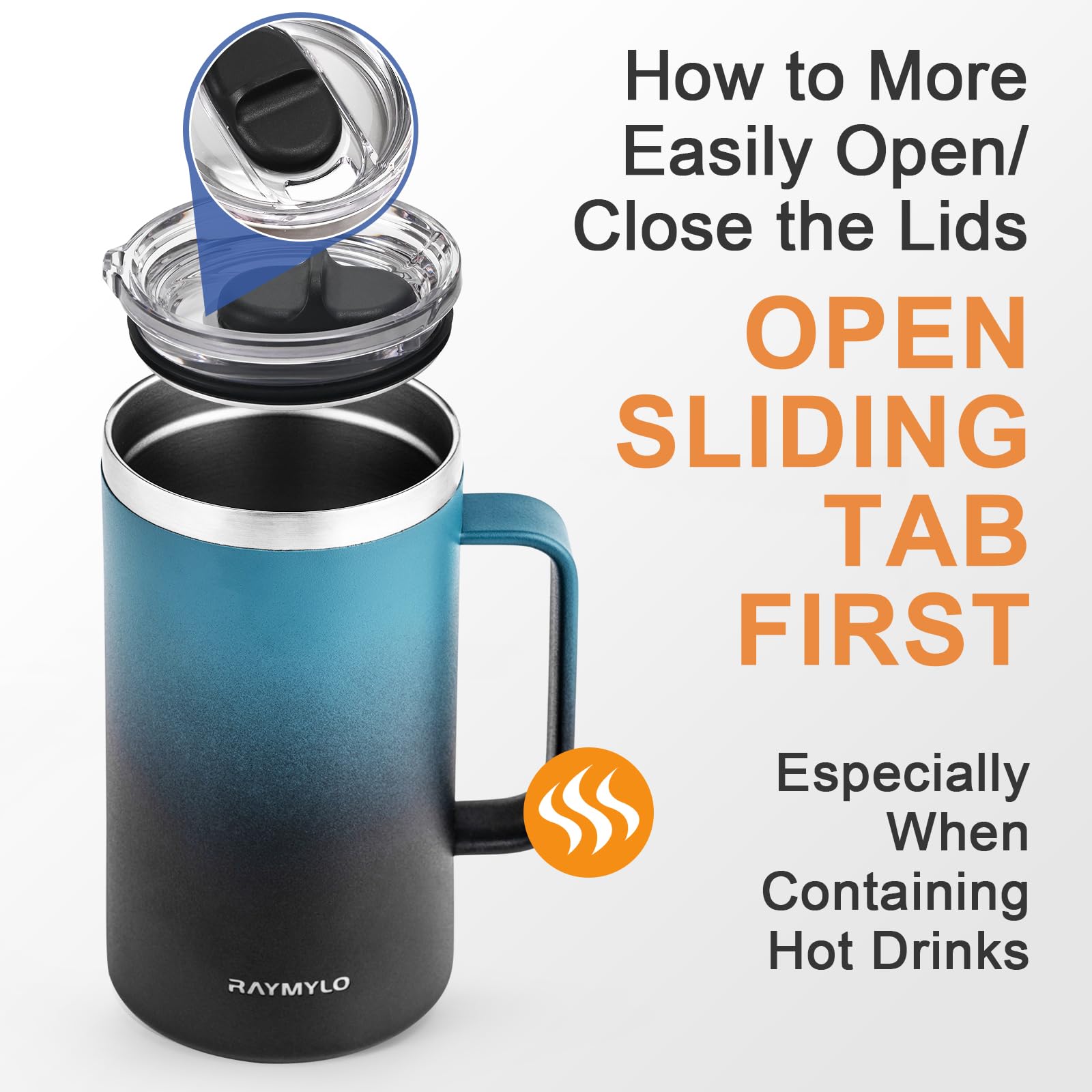 How to More Easily Open/Close the Lids: To ensure leak-proof performance, our lid is tightly sealed which may make it harder to remove or install. lf you face this issue, try two solutions: First, check if the sealing ring is properly positioned and adjust it if needed. Second, slide the tab while removing or installing to balance the internal andexternal air pressure.