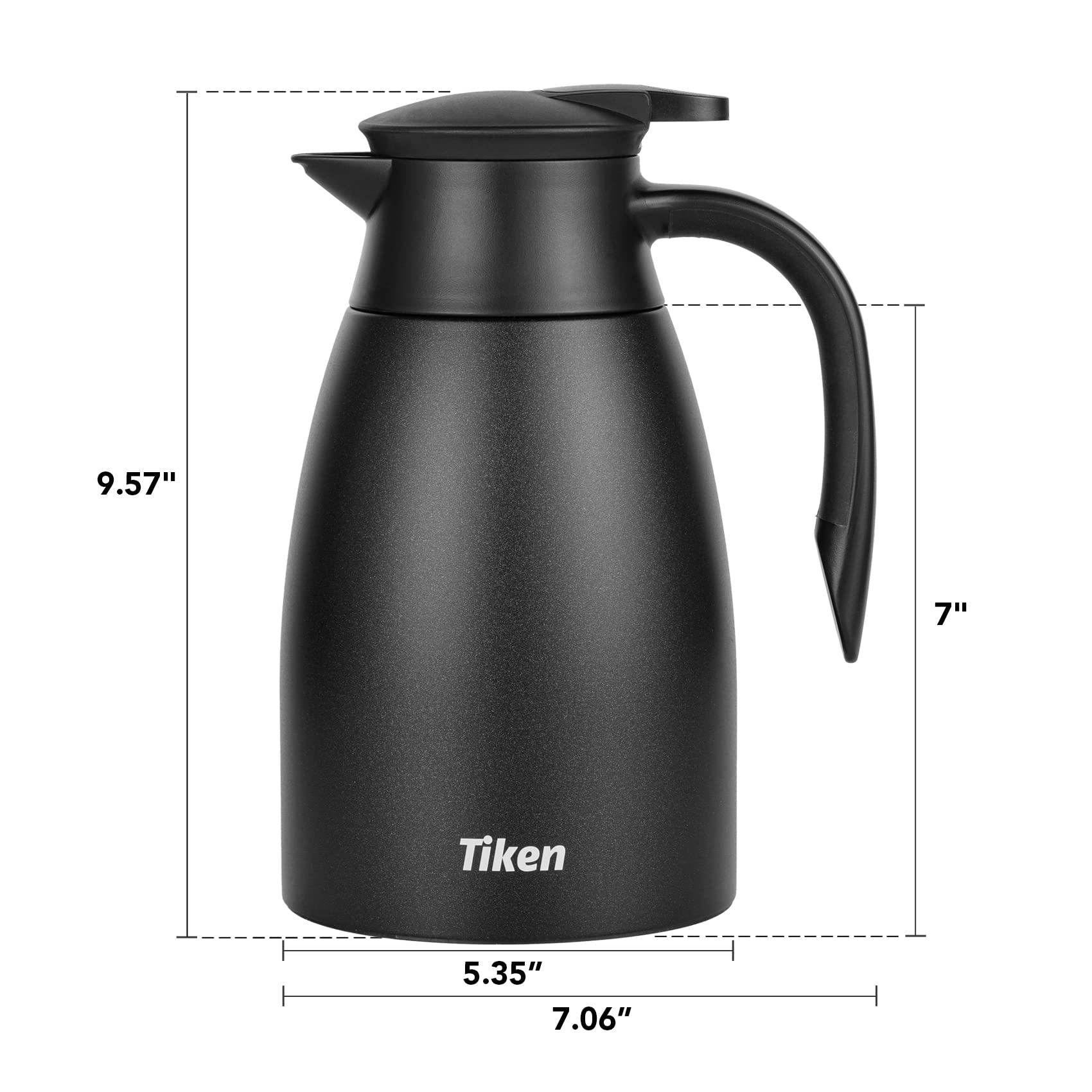 This coffee carafe has a capacity of 51 Oz (1.5L). Tiken vacuum insulation technology locks in temperature to preserve flavour and freshness, that keeps the temperature above 161.6°F at 12 hrs (assuming a starting temperature of 203°F, a room temperature of 68 °F and water left untouched throughout the duration of the test). Pls note test results will vary depending on beverage starting temperature and how full the carafe is.