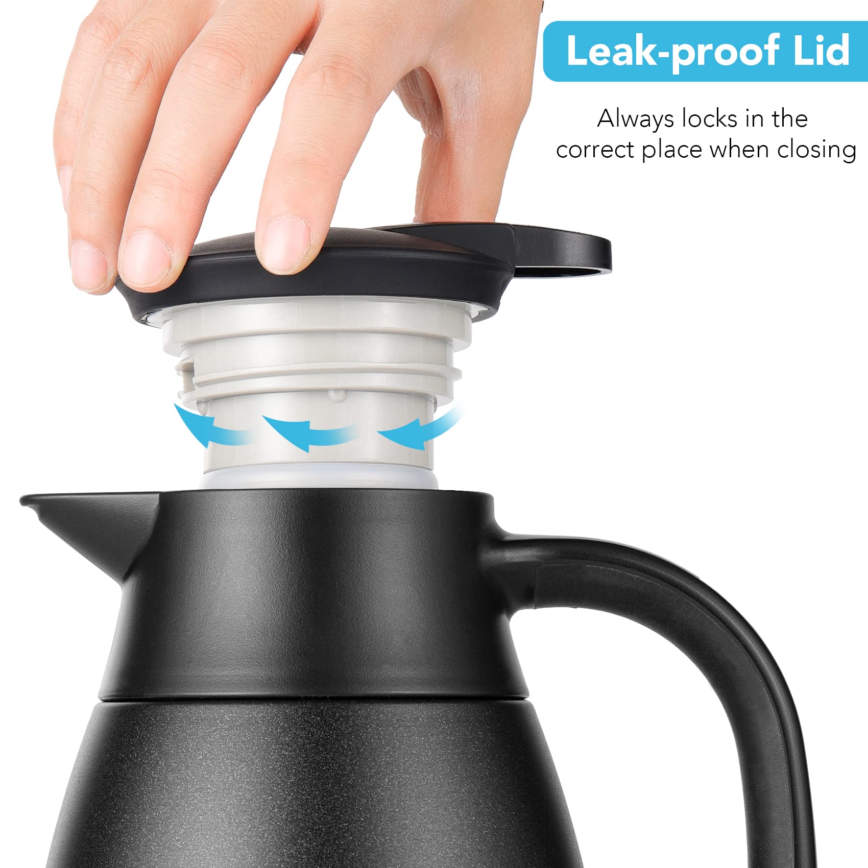 Groove spout and inner dual silicon rings are available, which avoid leaking when pouring water. Our leak-proof lid is designed with a new insulated and air-tight construction, always locks in the correct place when closing. Even with a slight tilt, the thermal carafe pitcher will not leak one single drip.