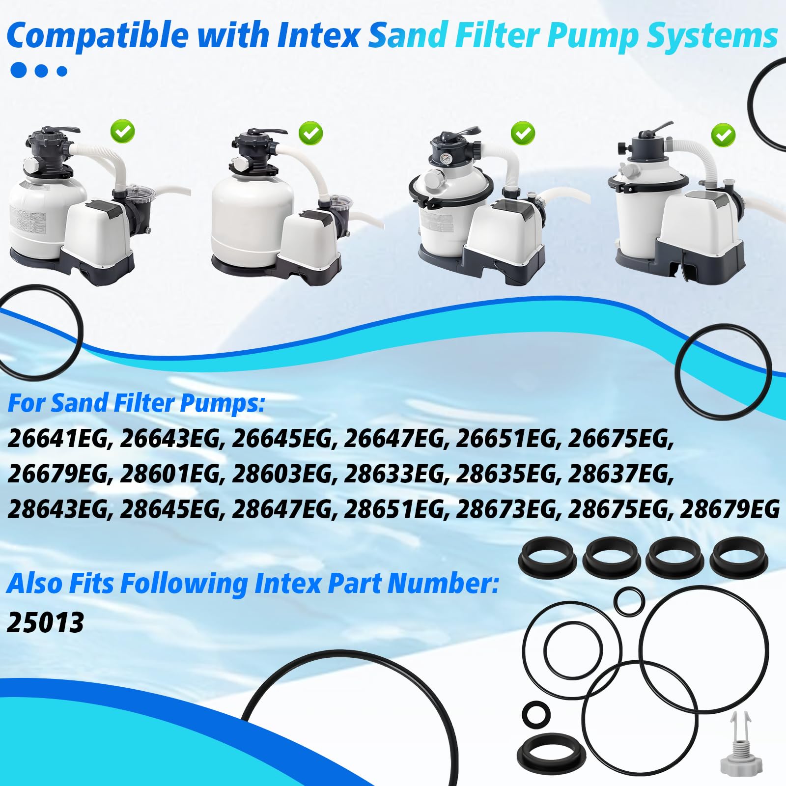 Precise Compatibility: Meticulously engineered for Intex Krystal Clear sand filter pump systems used in above-ground pools, this kit fully matches the replacement needs of Intex part number 25013. It is compatible with mainstream sand filter pump models including 26641EG, 26643EG, 26645EG, 26647EG, 26651EG, 26675EG, and more, ensuring a precise fit with equipment interfaces without the need for additional adjustments.