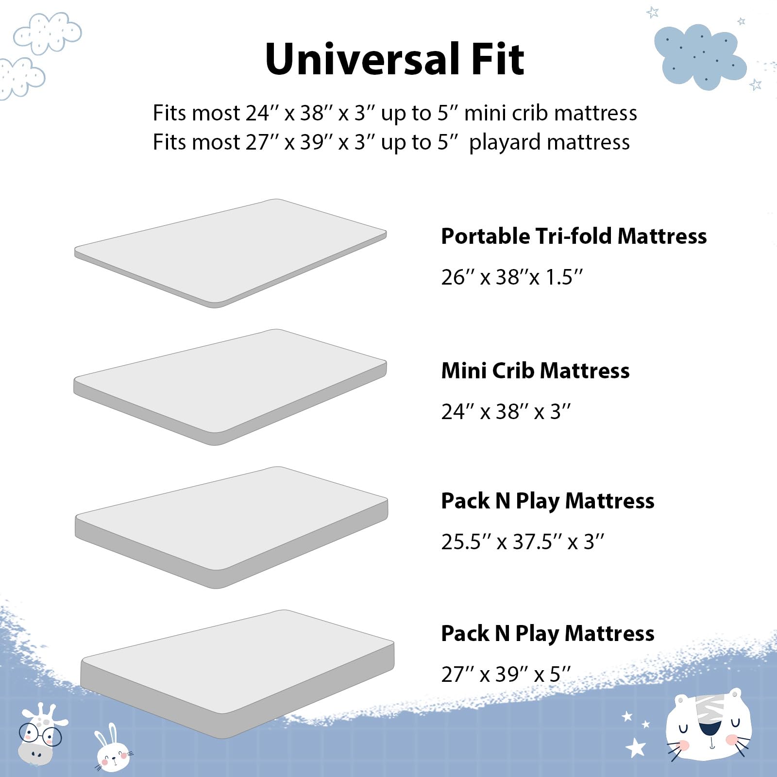 Snug Fit: Measuring 38” x 26”, our 3-pack mini crib sheets fit most baby portable plapens and pack n play mattresses. With elastic bands around the edges of the playard sheets, an 6-inch deep pocket, and stretchy fabric, they ensure a snug, wrinkle-free fit that stays securely in place.
