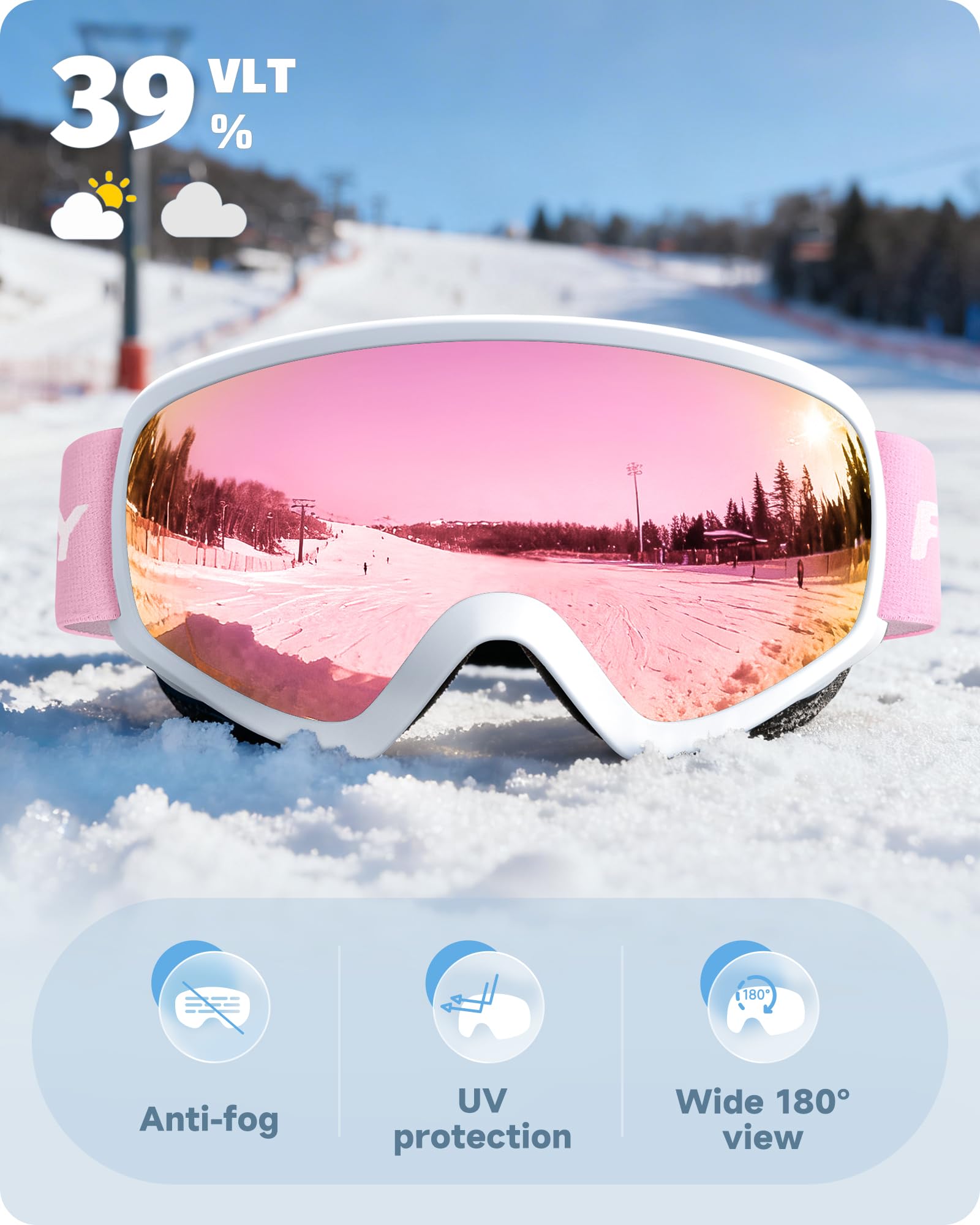 【OTG Desigh & Professional Ventilation】 Findway kids snow goggles are designed with cut-outs in the form that makes these goggles fit over most glasses and allows your kids to wear their eyeglasses inside the goggles. These goggles have professional ventilation system, it brings fresh air and exhaust moisture quickly and effectively. Reduce fogging up and optimize the flowing air over the inside of the lens.