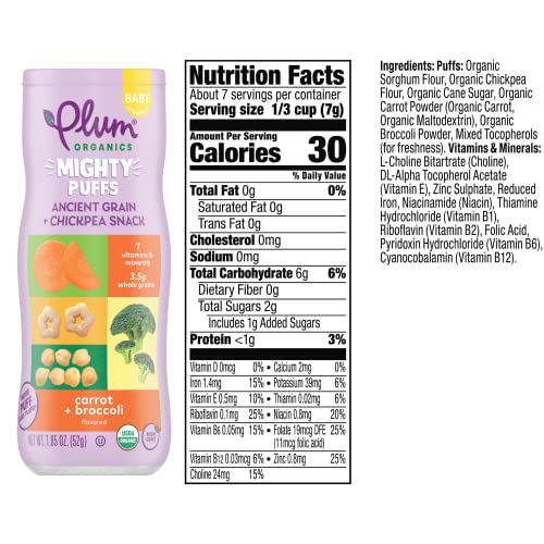 Mighty snack for a mighty tot. Plum Organics Mighty Puffs are a light and puffy organic baby snack that packs a Mighty punch, thanks to ancient grains and legumes like sorghum and chickpea. Each baby puffs canister is made with whole grains and organic ingredients to help nourish and fuel your growing baby. Mighty Puffs are the perfect baby snack to introduce independent eating and help develop motor skills with tasty veggie-forward flavors your little one will love. Now that's a Mighty good snack!
