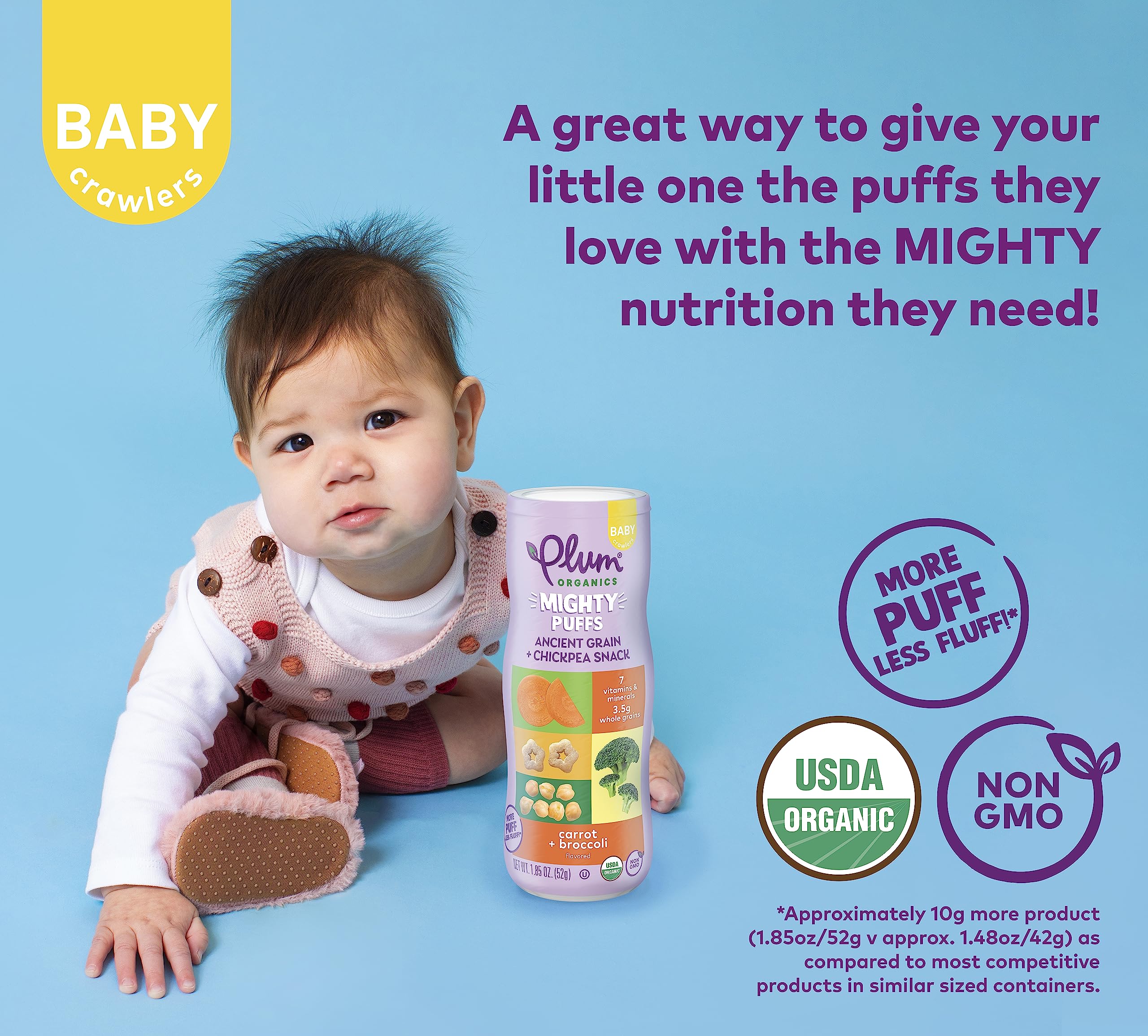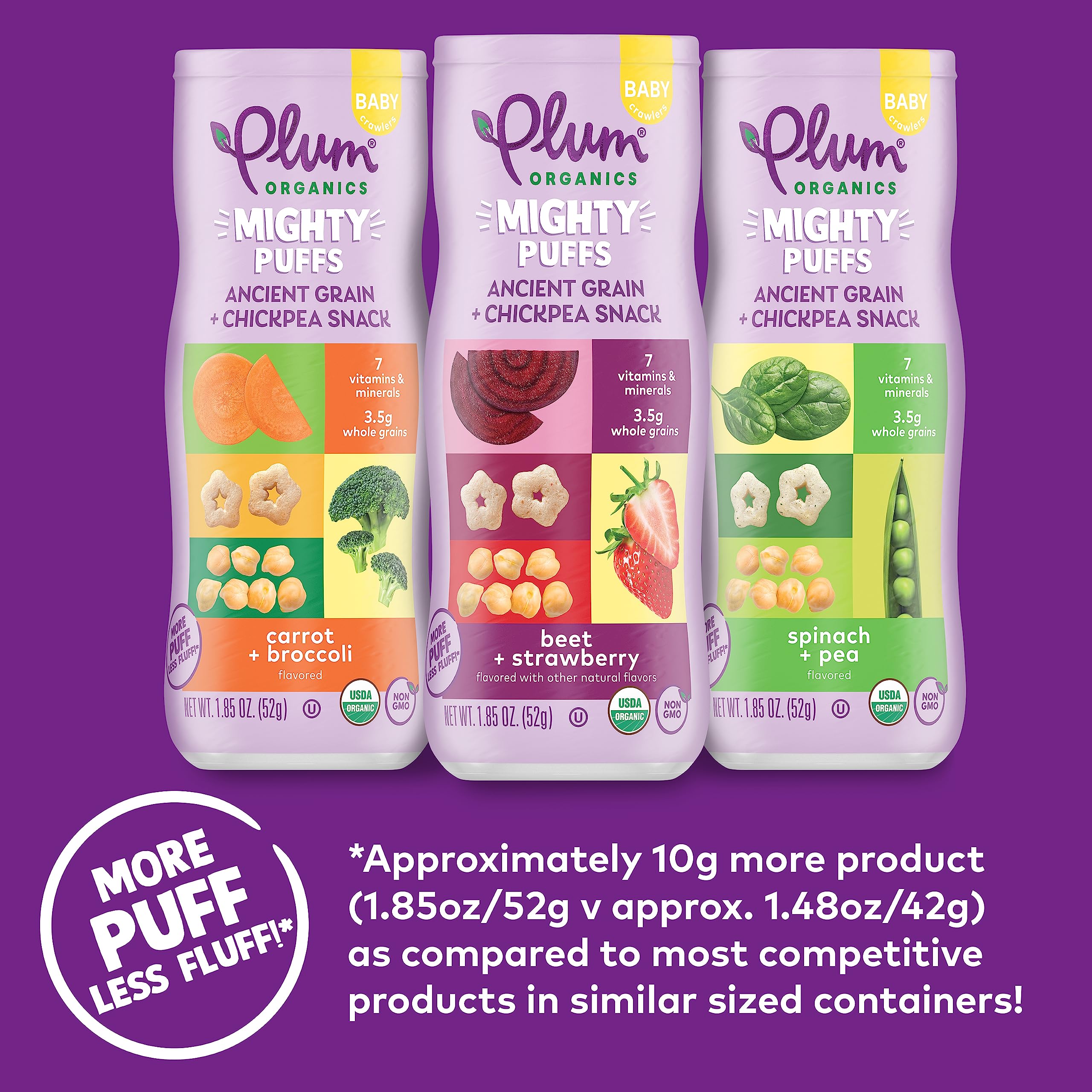 CONVENIENT BABY PUFFS: Plum Organics Mighty Puffs Baby Snacks are also available in other flavors