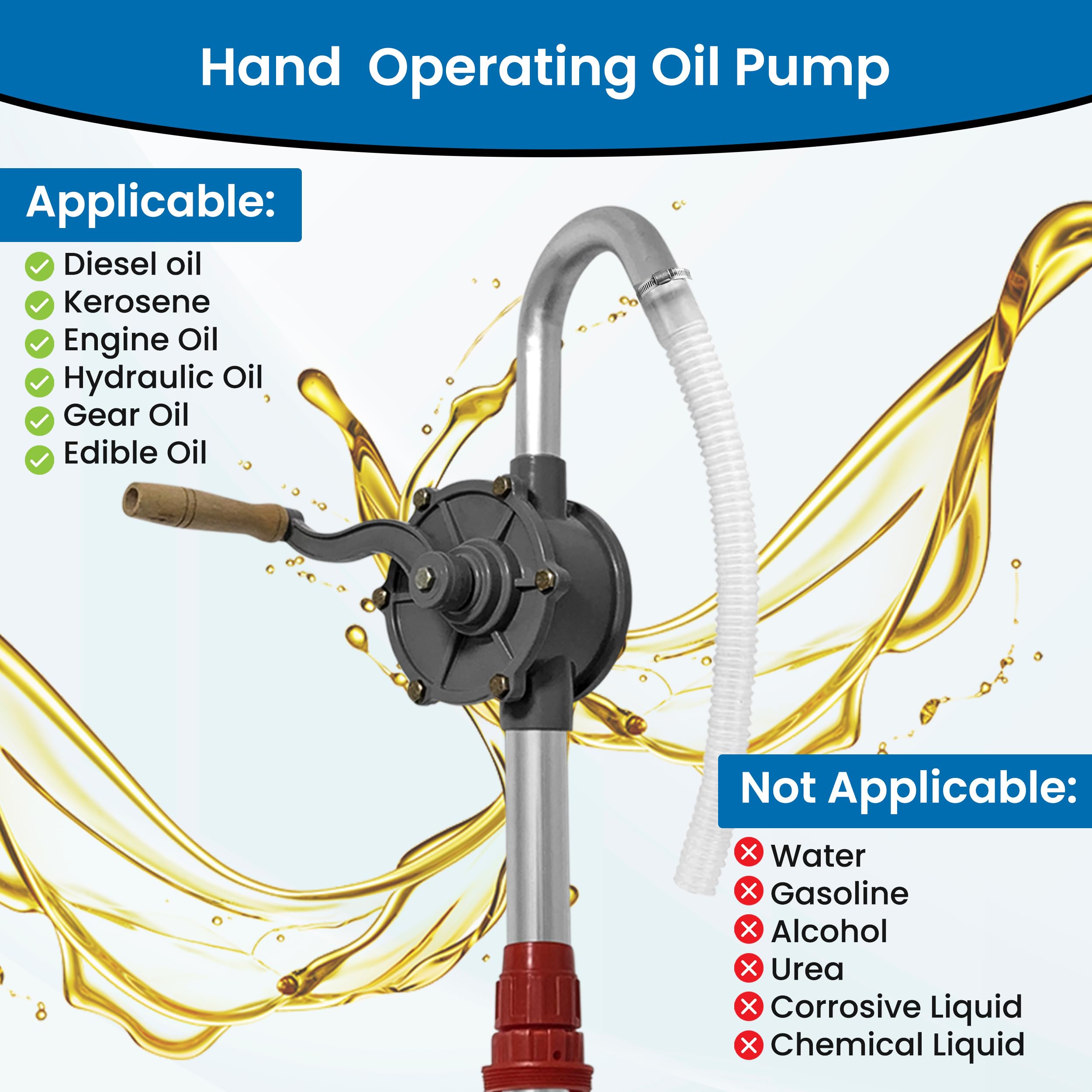 Versatile Compatibility - Ideal for transferring various fluids including oil, non potable water, and chemicals, this 5-55 gallon hand operated Aluminum and alloy drum pump ensures efficient and safe fluid handling. Pump can handle thicker fluids: engine oil, hydraulic oil, gear oil, edible oil, and thin fluids: diesel, kerosene.