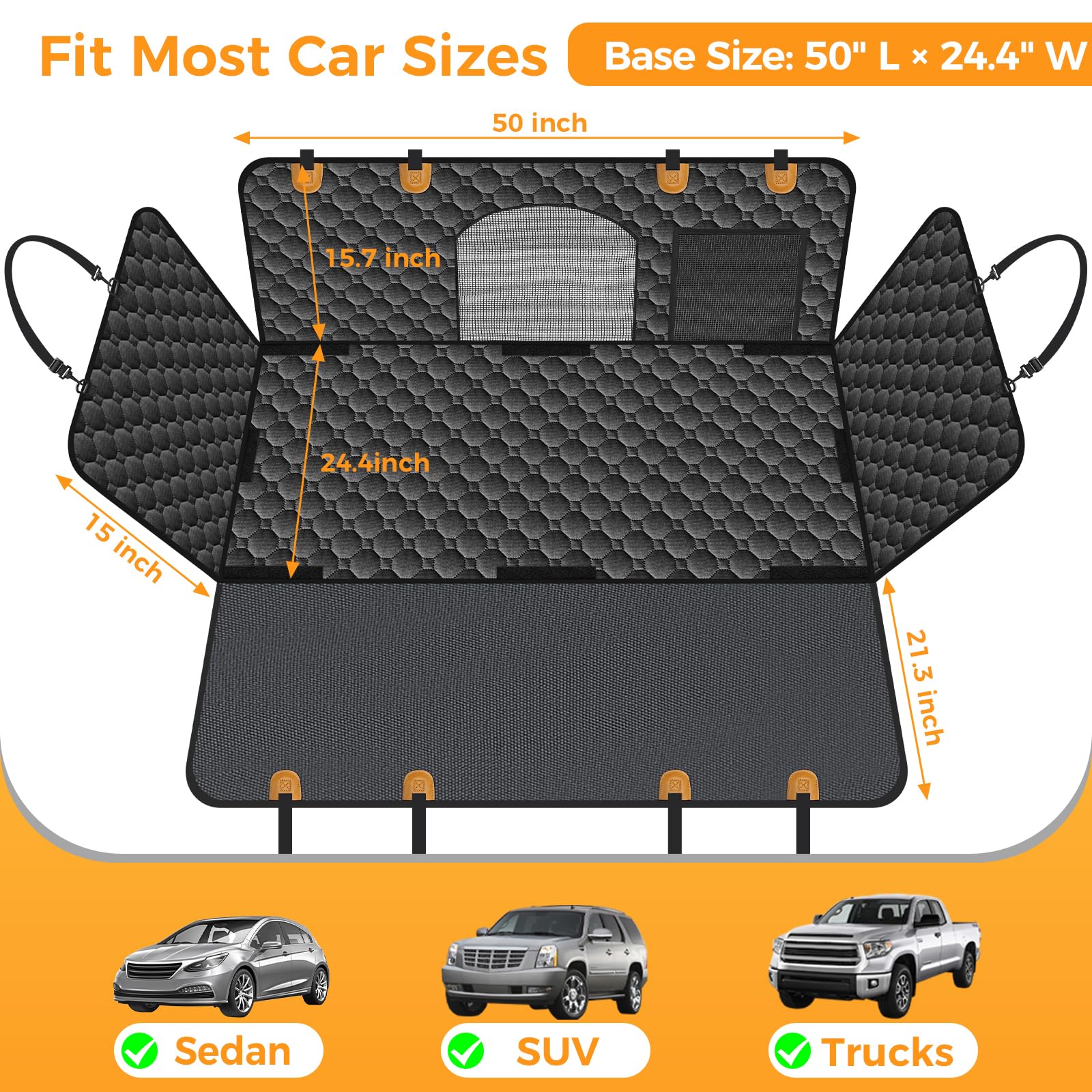 Universal Fit for Cars, SUVs & Trucks: With an overall base size of 51" L × 23.6" W, our dog car seat cover fits most sedans, SUVs, and trucks. This hard bottom dog seat cover doubles as a dog car seat cover for back seat or a dog hammock for car, providing large pets with a flat, stable resting space. (Note: not recommended for oversized truck, not for Nissan Titan XD or Silverado Z71).