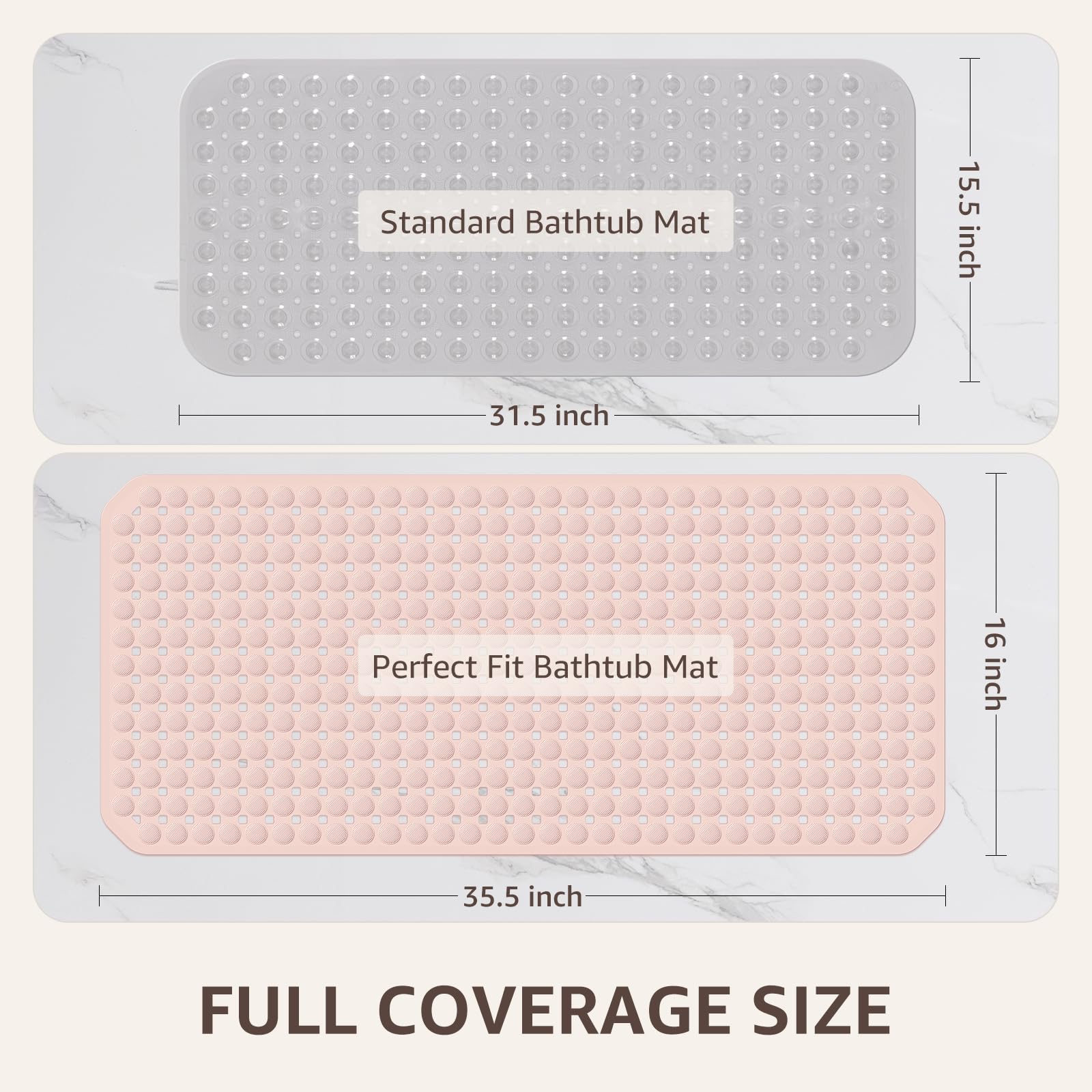 35x16 INCH Full Coverage Design: 20% larger than generic non slip bath mats, seamlessly fitting adult tubs and shower mats. No edge gaps when sitting or standing