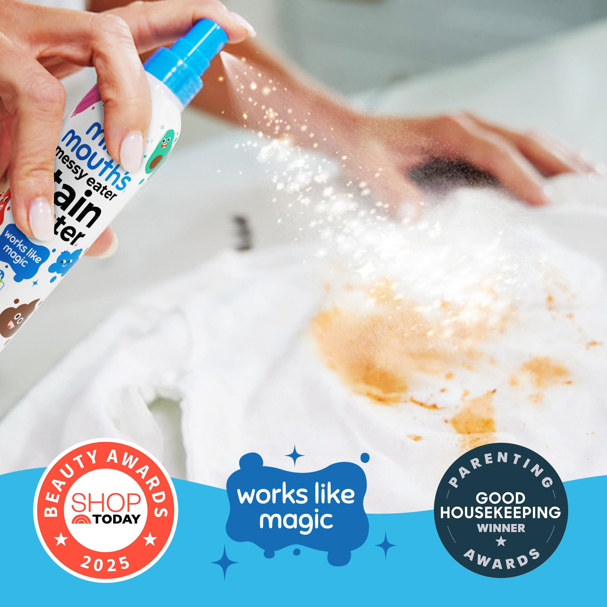 EASY TO USE: First, ditch the excess gunk and dampen dry stains with a splash of water. Spray on Miss Mouth’s, give it a little rub if needed, then toss it in the wash or clean as usual. Still see the stain? Hit repeat. Easy peasy.
